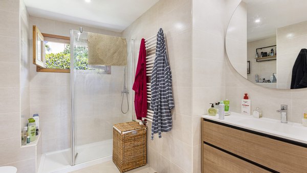 Das Objekt verfügt insgesamt über 4 Schlafzimmer und 2 Badezimmer (davon 1 en-suite) und bietet somit reichlich Platz für Ihre Familie und Gäste. Für angenehme Raumtemperaturen das ganze Jahr über sorgen eine Klimaanlage (w/k), eine Gaszentralheizung sowie ein offener Holzkamin, der zudem als stilvolles Designelement fungiert. Das Gebäude ist in zwei Etagen aufgeteilt. Im Erdgeschoss befinden sich das große Wohnzimmer mit einem einladenden Kamin in der Mitte, sowie die 4 Schlaf- und Badezimmer. Des Weiteren befindet sich die erst kürzlich renovierte Küche im unteren Stock, welche über einen zweiten Hauseingang verfügt. Dank der sorgfältigen Aufteilung des Hauses besteht die Gelegenheit, zusätzlich bis zu 190 m2 Wohnfläche zu schaffen. Die attraktive Außenausstattung, bestehend aus einem Süßwasserpool mit BBQ-Bereich und einem großzügigen Garten, rundet das Angebot gekonnt ab.