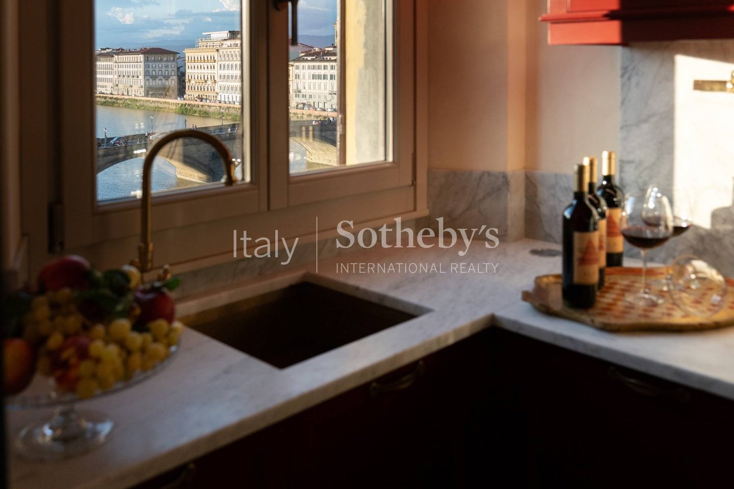 The residence is divided into two main areas: on one side, two elegant bedrooms with en-suite bathrooms and walk-in showers; on the other, a living area comprising a classically styled kitchen with views of the Ponte alla Carraia, a dining room, and a living room overlooking the Arno River.