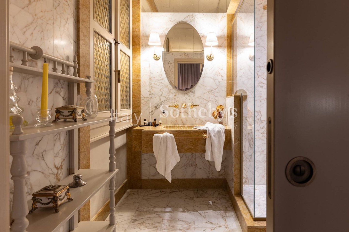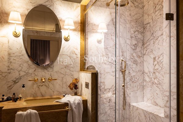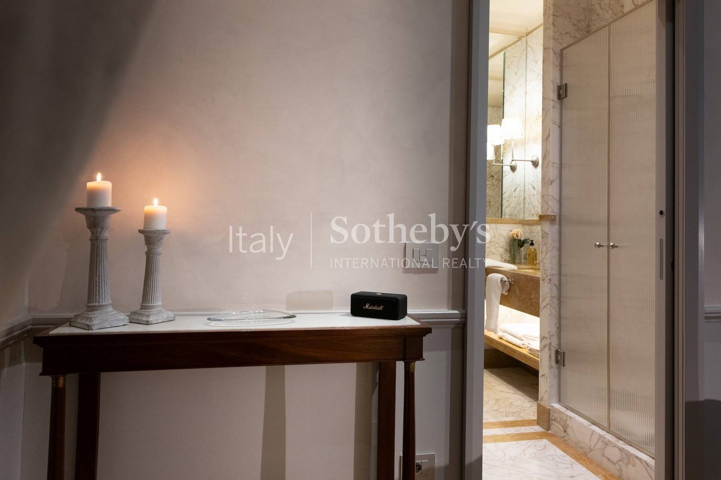 The interiors feature high-quality finishes, such as Carrara marble floors and dark reclaimed wood parquet, handcrafted paneling, and neutral tones that create a refined and welcoming atmosphere. The apartment is equipped with all modern amenities, including Smart TV, Wi-Fi, and Bluetooth speakers, and includes bottles of wine from the family estate in Chianti.