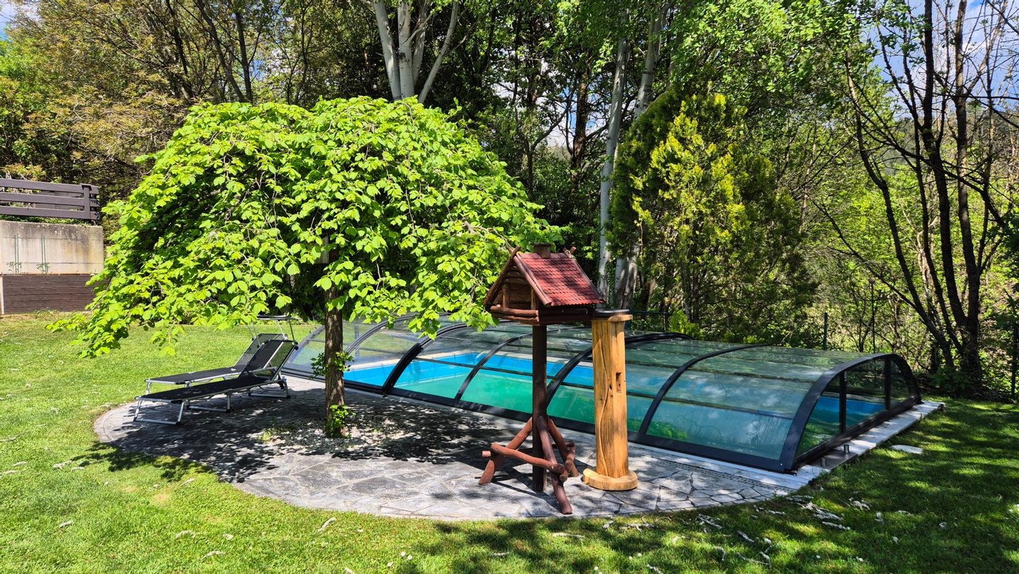 Im sonnigen Garten mit Pool erleben Sie Urlaub zu Hause: Morgens barfuß durch das Gras, nachmittags im Pool abkühlen und abends bei einem Glas Wein den Ausblick genießen – mit freiem Blick auf die Naturkulisse des Goldecks.