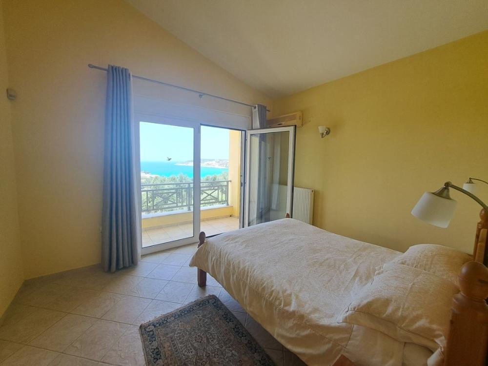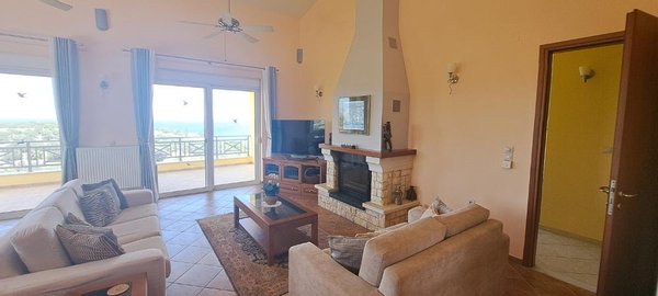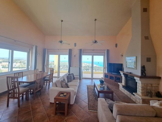 Hauptwohnung (Erdgeschoss): 100 m², 1 geräumiges Schlafzimmer, großer Wohnbereich, Kamin und direkter Zugang zur Terrasse mit Meerblick.