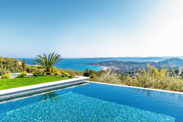 Domaine de la Nartelle. Ein herrlicher Panoramablick auf das Meer für diese herrliche, moderne Villa. Empfangshalle, geräumiges Wohnzimmer mit Kamin, das sich zu einer überdachten Terrasse und einem Innenhof mit Brunnen öffnet, ausgestattete offene Küche, Hauswirtschaftsraum mit Kühlraum, Esszimmer, 4 Suiten mit eigenen begehbaren Kleiderschränken, Duschbäder und WCs, Schlafsaal mit Duschbad und WC, Hammam und Fitnessraum. Garage. Beheizter Infinity-Pool.