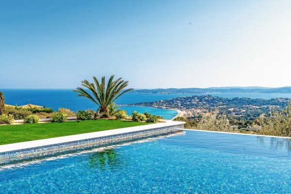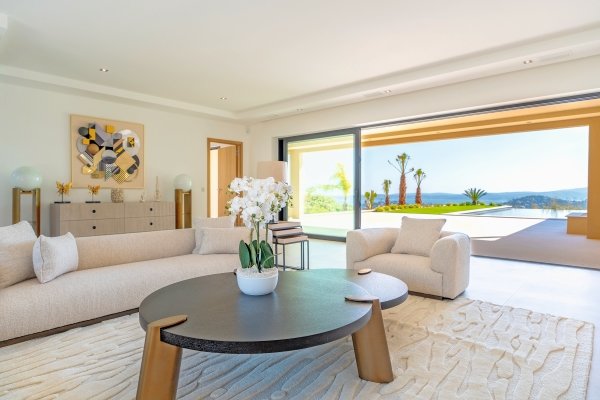 Domaine de la Nartelle. Eine großartige Panoramasicht auf das Meer für diese hervorragende zeitgenössische Villa. Aufnahmehalle, großes Wohnzimmer mit Kamin, der zu einer überdachten Terrasse hinausgeht, und eine Terrasse mit Brunnen, ausgestattete offene Küche, Hauswirtschaftsraum mit Kühlraum, Speisezimmer, 4 Suiten mit eigenen begehbaren Kleiderschränken, Bade-/Duschräume und WCs, Schlafsaal mit Dusche und WC, Hammam und Fitnessstudio. Garage. Beheizter Infinity-Pool.