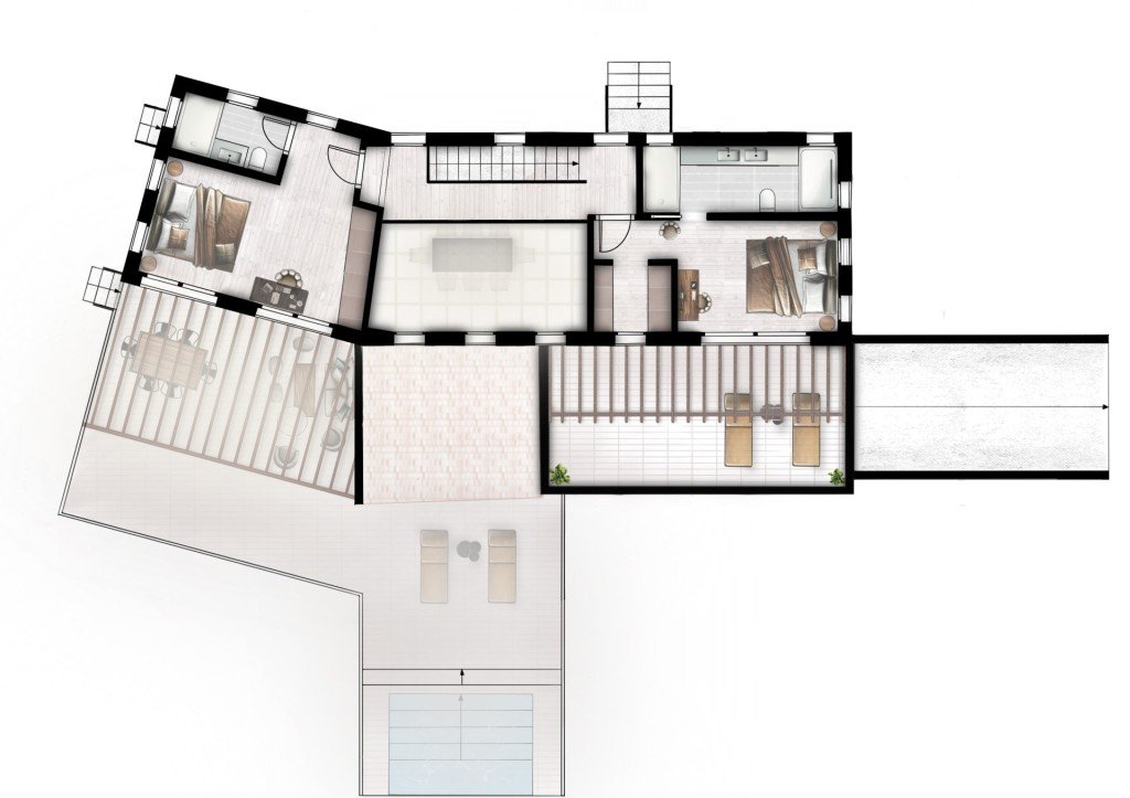 Das genehmigte Villenprojekt umfasst ein 191 m² großes Untergeschoss mit Parkplätzen und einem Weinkeller, ein 189 m² großes Erdgeschoss und ein 88 m² großes Obergeschoss.