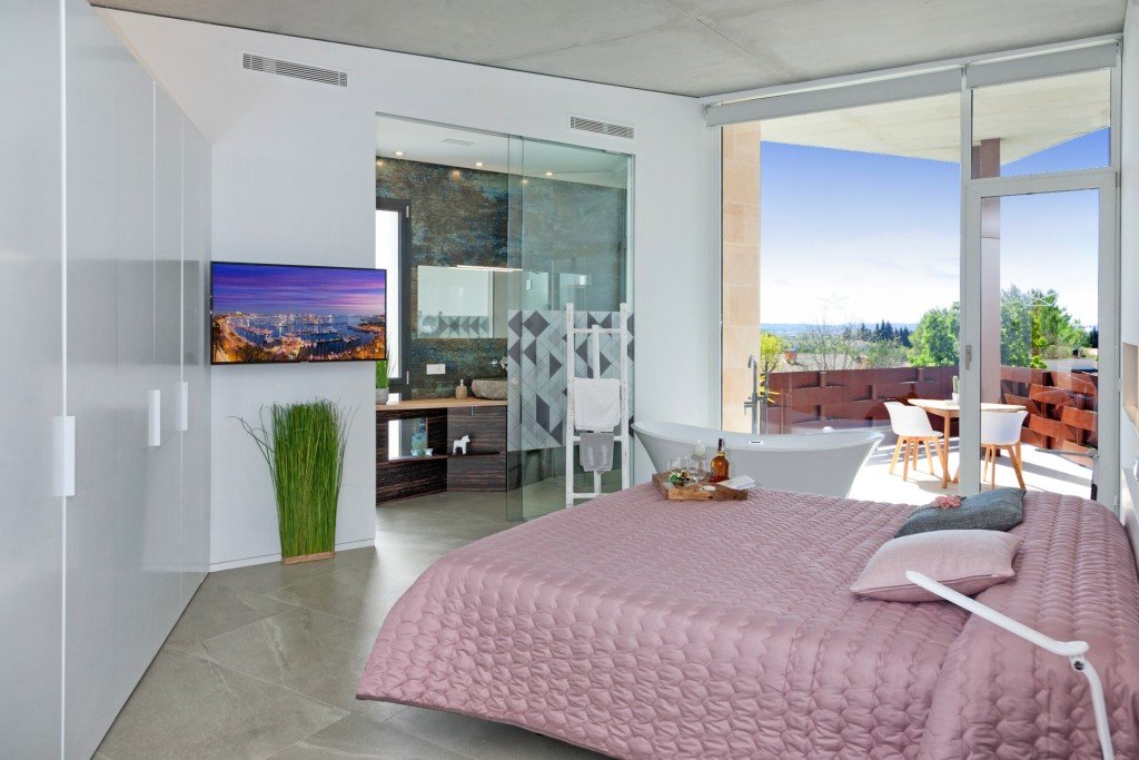 Der großzügige Innenraum überzeugt mit einem offenen Grundriss, hohen Decken und einem modernen, geschlossenen Kamin, der eine helle, einladende Atmosphäre schafft und nahtlos auf die Terrassen und den Außenbereich übergeht. Es gibt vier elegante Schlafzimmer mit eigenem Bad, hochwertigen Ausstattungen und viel Stauraum, darunter eine großzügige Hauptsuite mit begehbarem Kleiderschrank. Die weiteren Schlafzimmer verfügen über maßgefertigte Einbauschränke. Insgesamt stehen fünf luxuriöse Badezimmer sowie ein Gäste-WC zur Verfügung, alle mit hochwertigen, zeitgemäßen Armaturen.