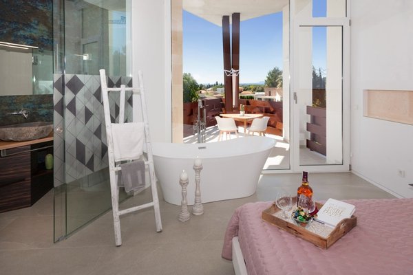 Der großzügige Innenraum überzeugt mit einem offenen Grundriss, hohen Decken und einem modernen, geschlossenen Kamin, der eine helle, einladende Atmosphäre schafft und nahtlos auf die Terrassen und den Außenbereich übergeht. Es gibt vier elegante Schlafzimmer mit eigenem Bad, hochwertigen Ausstattungen und viel Stauraum, darunter eine großzügige Hauptsuite mit begehbarem Kleiderschrank. Die weiteren Schlafzimmer verfügen über maßgefertigte Einbauschränke. Insgesamt stehen fünf luxuriöse Badezimmer sowie ein Gäste-WC zur Verfügung, alle mit hochwertigen, zeitgemäßen Armaturen.