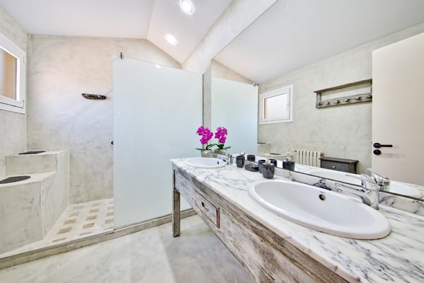 Im Obergeschoss befinden sich drei Doppelschlafzimmer, zwei Familienbäder und eine große Terrasse mit Blick auf den Garten und die Berge.