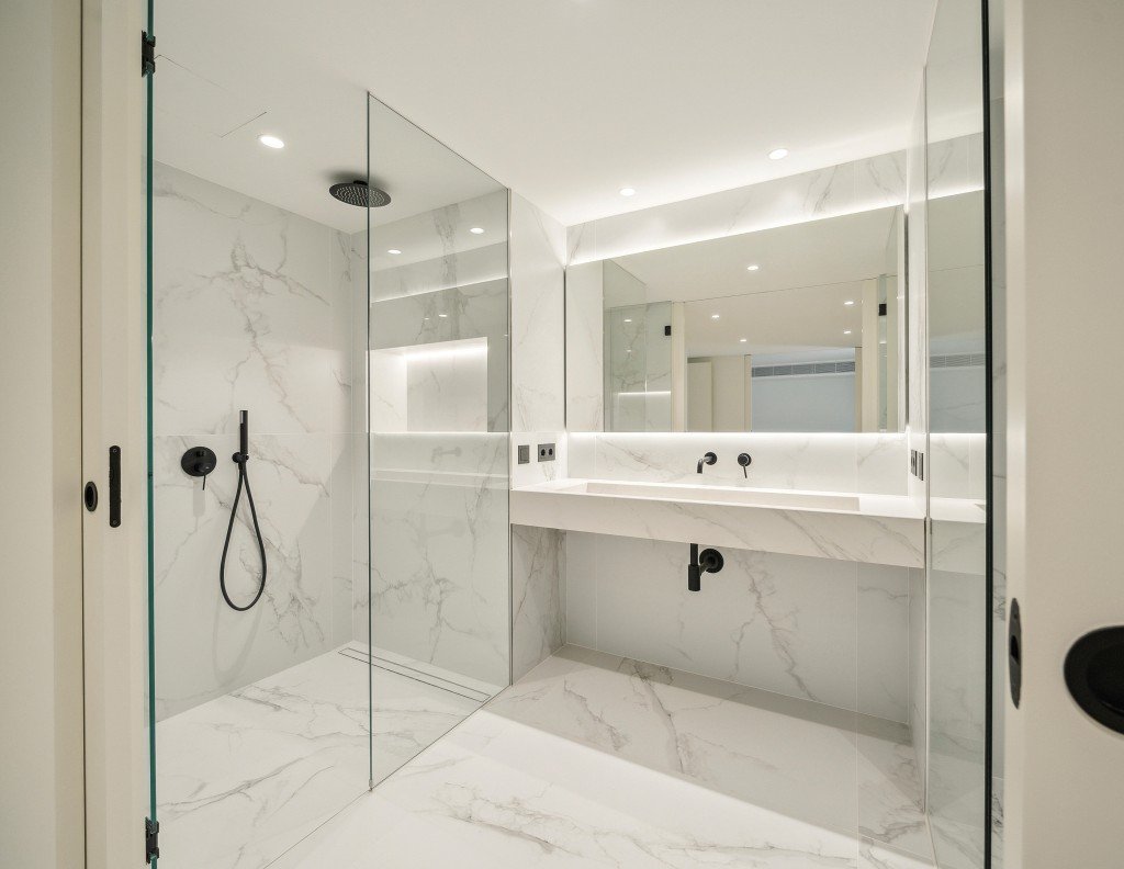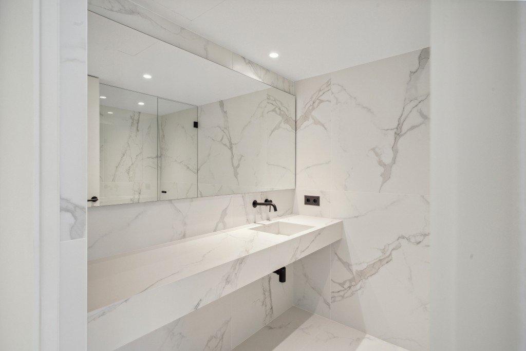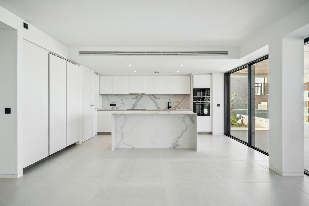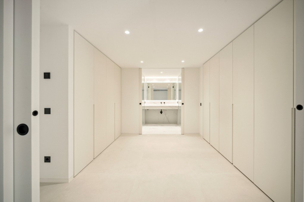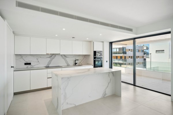 Exklusive Ausstattungsmerkmale: individuell regulierbare Klimaanlage und Fußbodenheizung (über Wärmepumpe) im gesamten Apartment und Spa-Bereich, großflächige Aluminiumfenster von Cortizo oder vergleichbar, motorisierte Außenrollläden, raumhohe Türen sowie Natursteinfliesen (Marés oder ähnlich, 100x100 cm) im unteren Bereich. Innen sorgen Bambusparkett und Bambusbelag auf dem Solarium für ein elegantes Ambiente. Die Cocinart-Küche ist mit Siemens- oder vergleichbaren Einbaugeräten ausgestattet. Ein Hauswirtschaftsraum, ein Gäste-WC und ein Gira/KNX Smart-Home-System runden das Angebot ab.