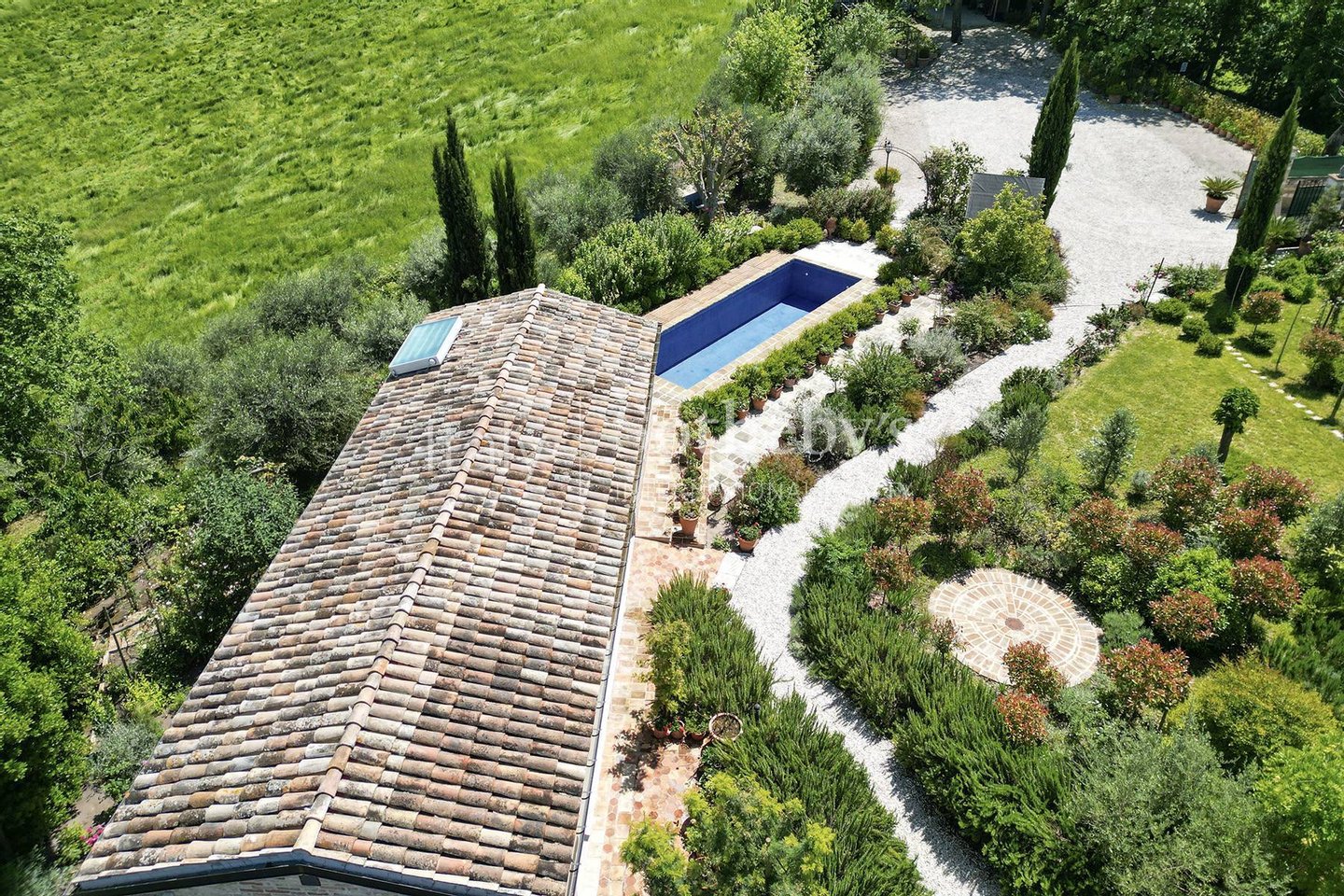 Im Außenbereich laden ein 3x10 m großer Pool mit Mosaikverkleidung, gepflegte Gärten mit einer beeindruckenden Rosensammlung, aromatischen Kräutern und ausgewachsenen Bäumen zum Verweilen ein. Die Bewässerung erfolgt über einen 25 m tiefen Brunnen und Regenwassersammelzisternen. Zudem gibt es mehrere Nebengebäude.