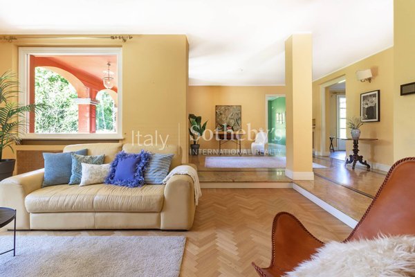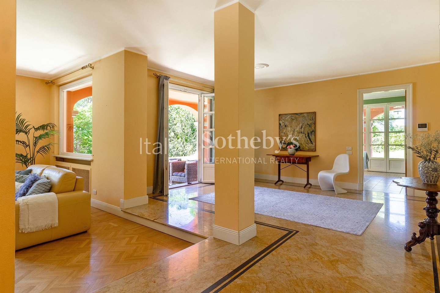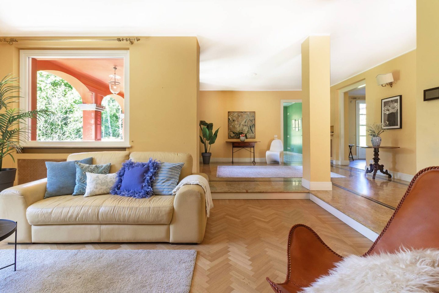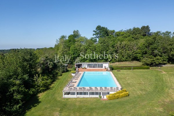 Auf dem Kamm eines Hügels gelegen, ist die Villa von einem Kastanienwald umgeben, durch den eine lange Zufahrtsstraße führt, die entweder zur Eingangszone oder direkt zur Garage führt. Die Villa befindet sich in ausgezeichnetem Pflegezustand und zeichnet sich durch hochwertige Details und edle Ausstattungen aus, wie die Wandverkleidungen (Boiserien) im Wohnzimmer, die Intarsien-Marmorböden sowie Fischgrätparkett. Sie erstreckt sich über drei Ebenen.