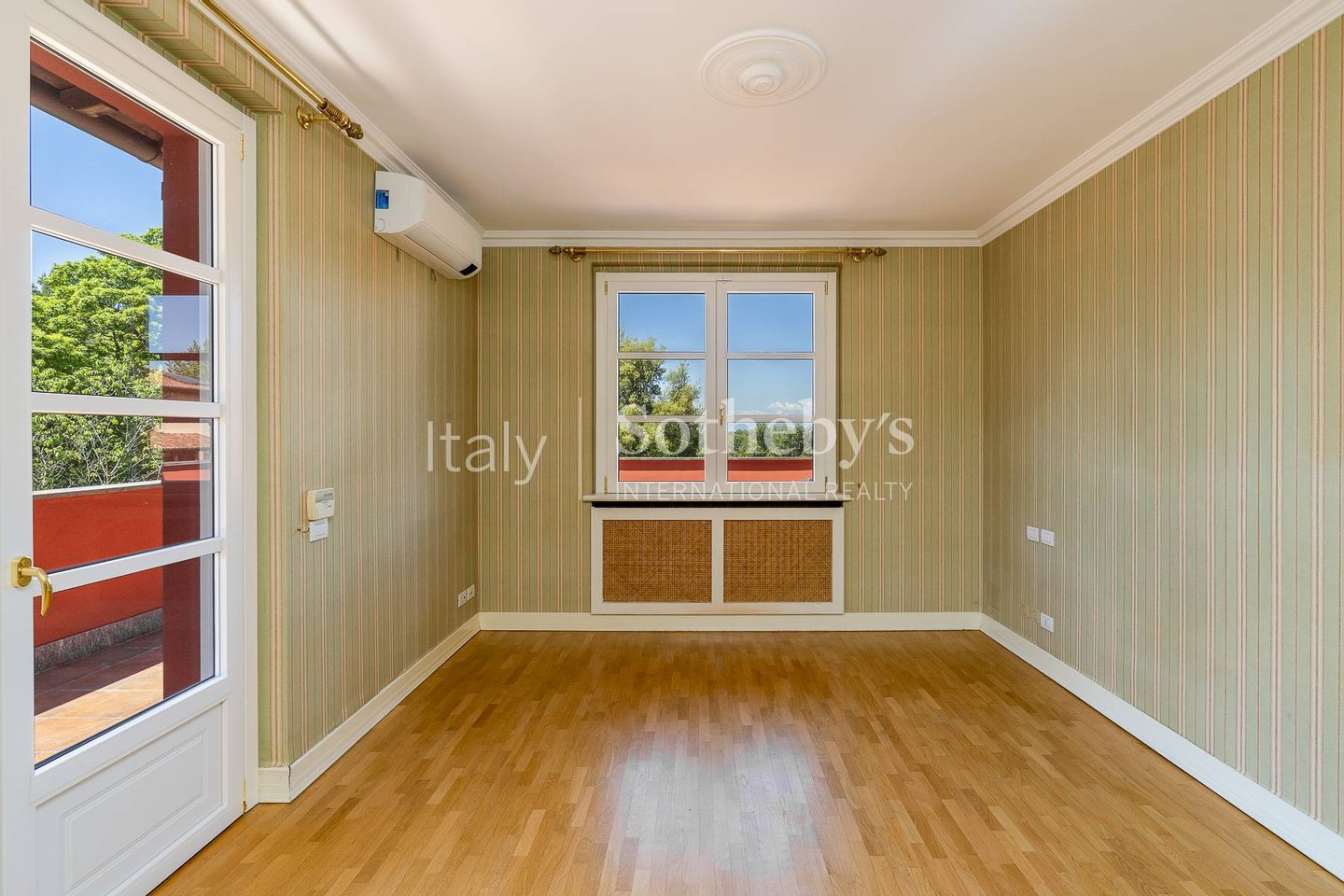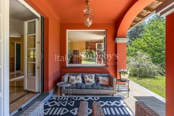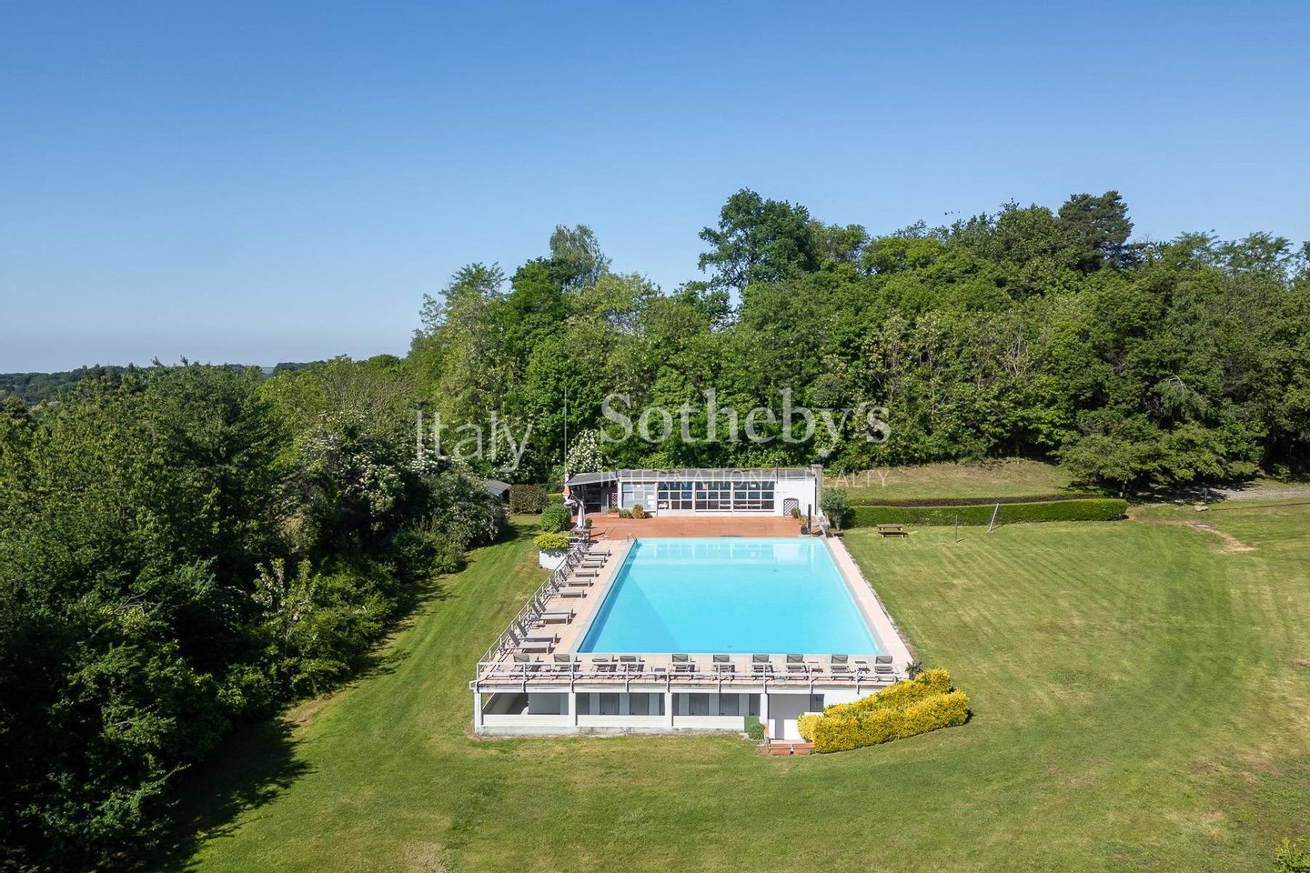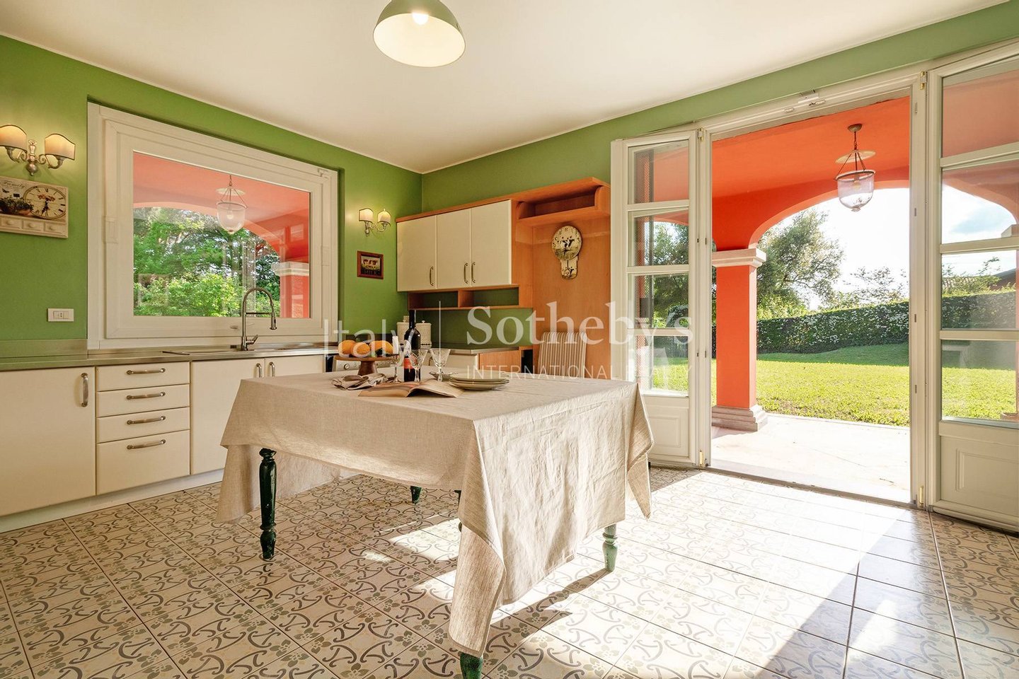 Auf dem Kamm eines Hügels gelegen, ist die Villa von einem Kastanienwald umgeben, durch den eine lange Zufahrtsstraße führt, die entweder zur Eingangszone oder direkt zur Garage führt. Die Villa befindet sich in ausgezeichnetem Pflegezustand und zeichnet sich durch hochwertige Details und edle Ausstattungen aus, wie die Wandverkleidungen (Boiserien) im Wohnzimmer, die Intarsien-Marmorböden sowie Fischgrätparkett. Sie erstreckt sich über drei Ebenen.
