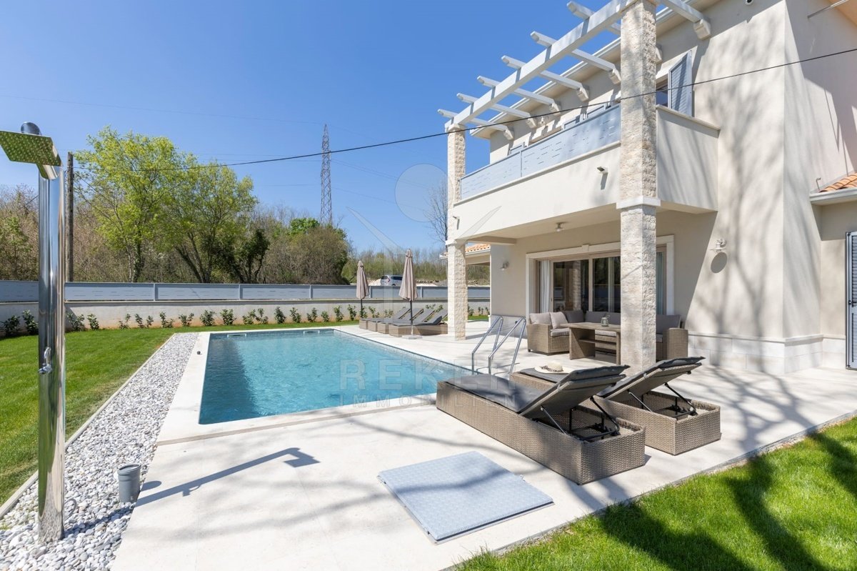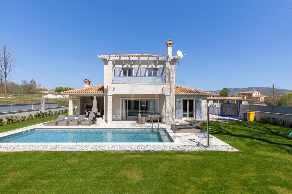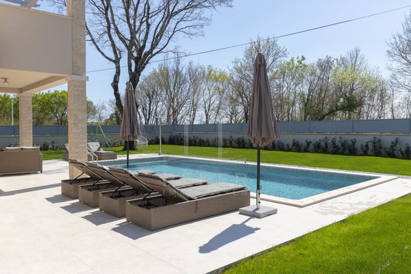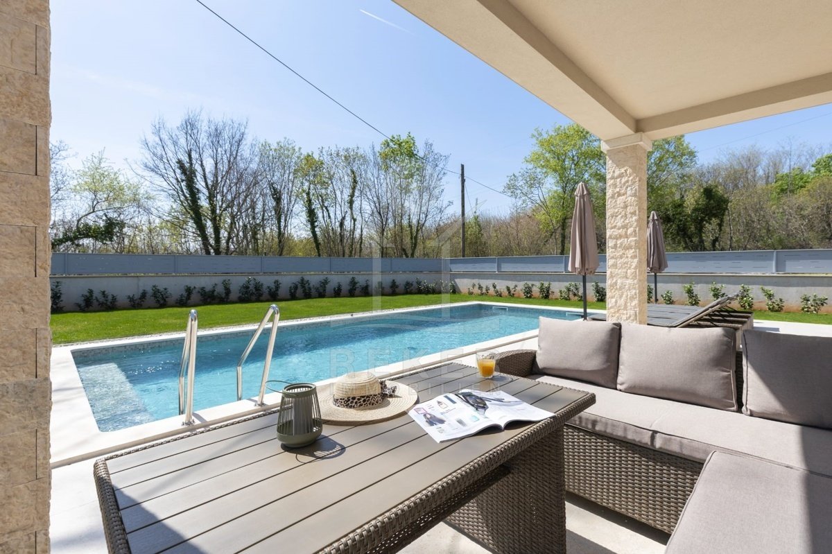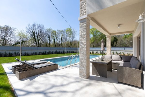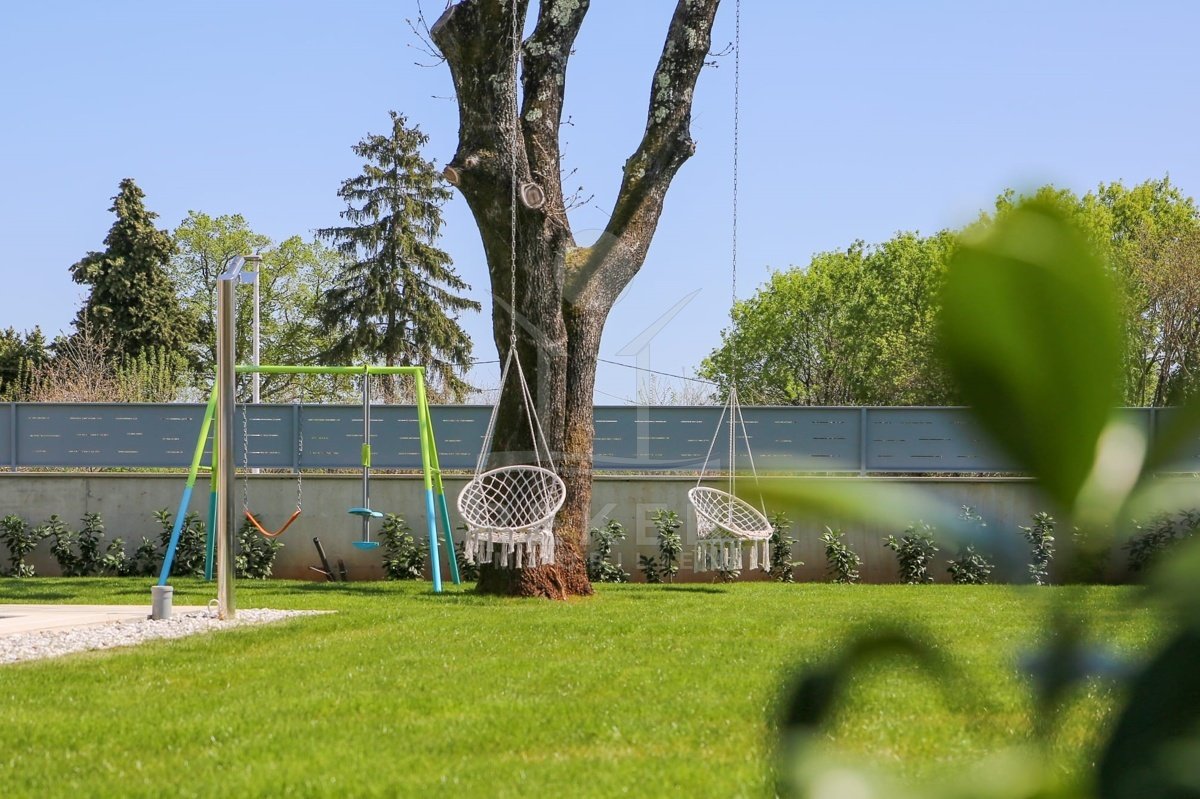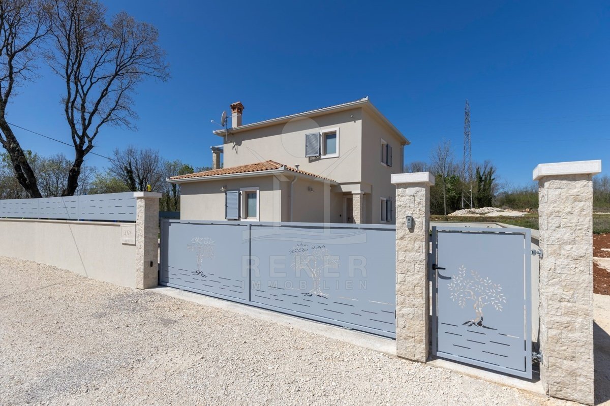 Dieses moderne Haus liegt am grünen Dorfrand von Labin. Ruhig, freundlich, naturnah. Der Garten grenzt direkt an eine bewaldete Fläche. Ideal, wenn Sie Ruhe suchen oder Platz zum Spielen für Kinder brauchen. Einkaufsmöglichkeiten, Schule und
