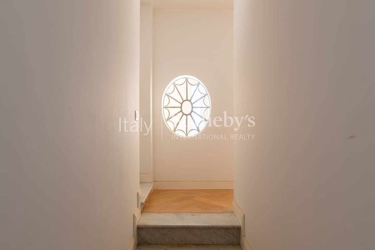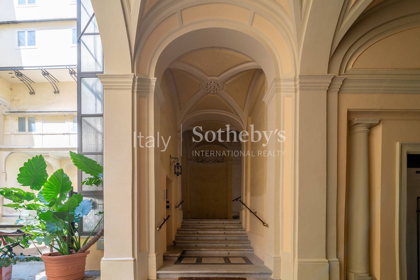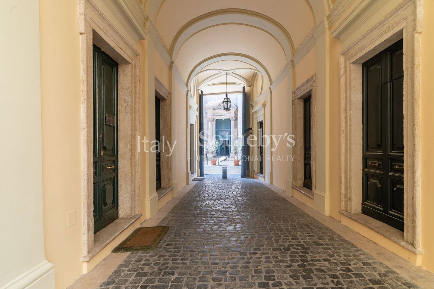 Einzigartig in ihrer Art, erstreckt sich die Immobilie rund um einen stimmungsvollen Innenhof und genießt Ausblicke auf alle Seiten des imposanten Palastes. Die großzügigen und lichtdurchfluteten Räume werden durch sichtbare Holzbalkendecken veredelt, die eine warme und elegante Atmosphäre schaffen. Einige Zimmer öffnen sich zu reizvollen privaten Terrassen - perfekte Orte für entspannte Momente. Eine eindrucksvolle Wendeltreppe aus dem 17. Jahrhundert führt schließlich zu einer spektakulären Dachterrasse von über 100 m² - ein wahres Juwel über den Dächern Roms mit atemberaubendem Blick auf Kuppeln und historische Monumente.