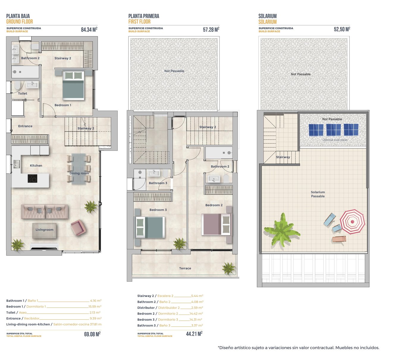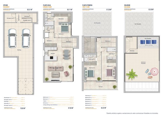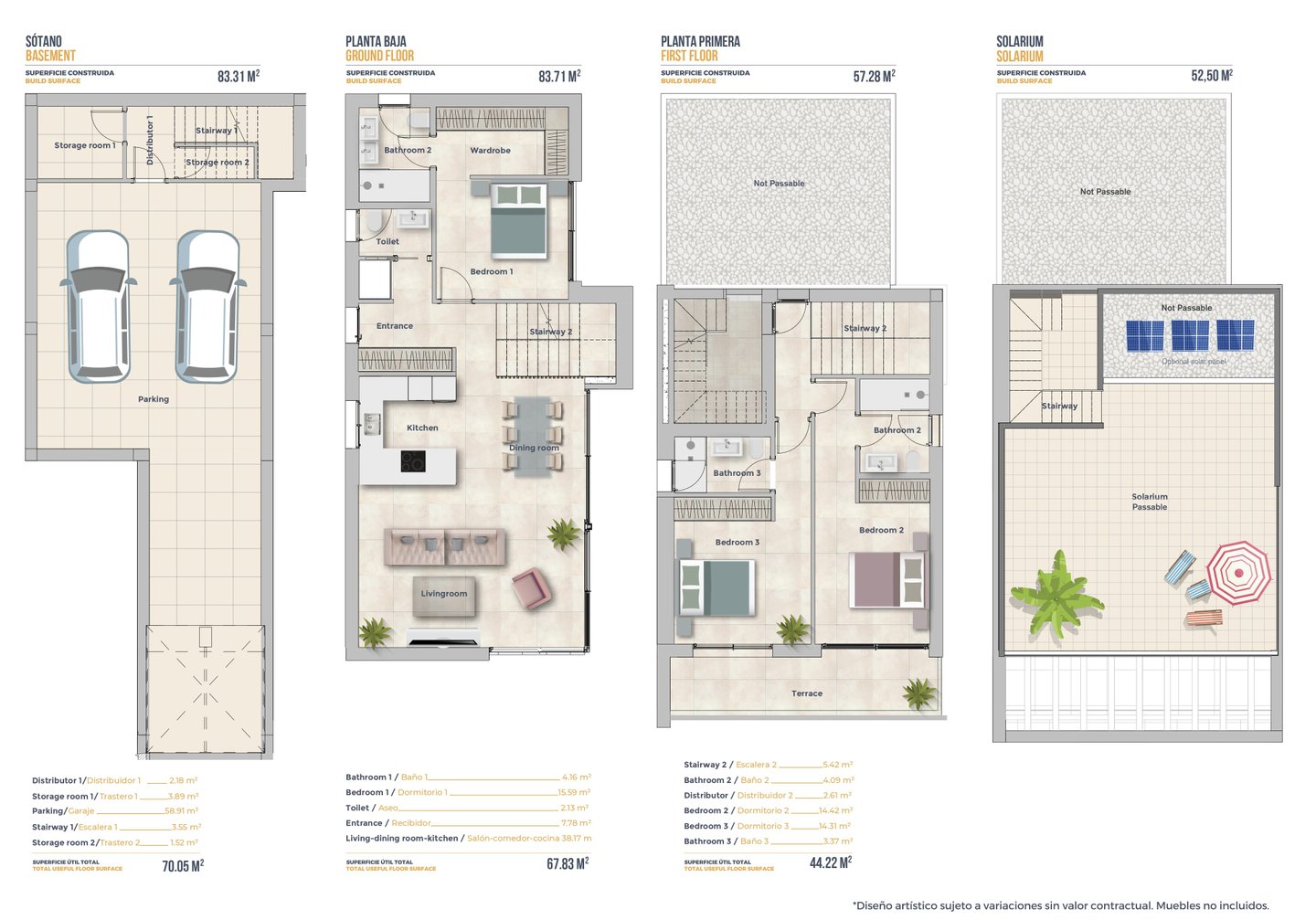 Die hier präsentierten Villen verfügen über ca. 141 m² Wohnfläche auf Grundstücken von 318 bis 433 m². Es stehen Ihnen 3 Schlafzimmer, 3 Badezimmer en suite, ein zusätzliches Gäste-WC, ein großzügiger Wohn-Essbereich mit moderner Einbauküche sowie eine beeindruckende Dachterrasse mit 52 m² zur Verfügung – ideal zum Sonnenbaden, Entspannen oder Genießen der Aussicht. Optional ist bei einigen Einheiten ein Keller mit Garage (83–97 m²) realisierbar.
