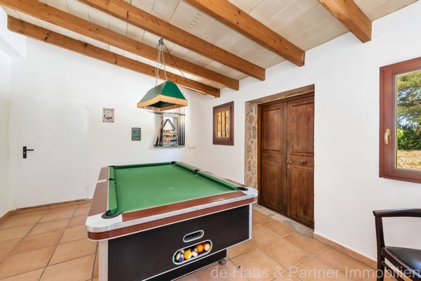 Im Untergeschoss befinden sich ein weiteres Wohnzimmer, 2 Schlafzimmer und ein schönes Bad. Auf dieser Etage gibt es auch einen Spielraum mit Billardtisch und Darts Scheibe, von dem man auch nach draußen zur Boulebahn kann.