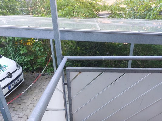 Ein edler Metallcarport mit Glasdach erwartet Ihr Auto und hellt es frostfrei und trocken.