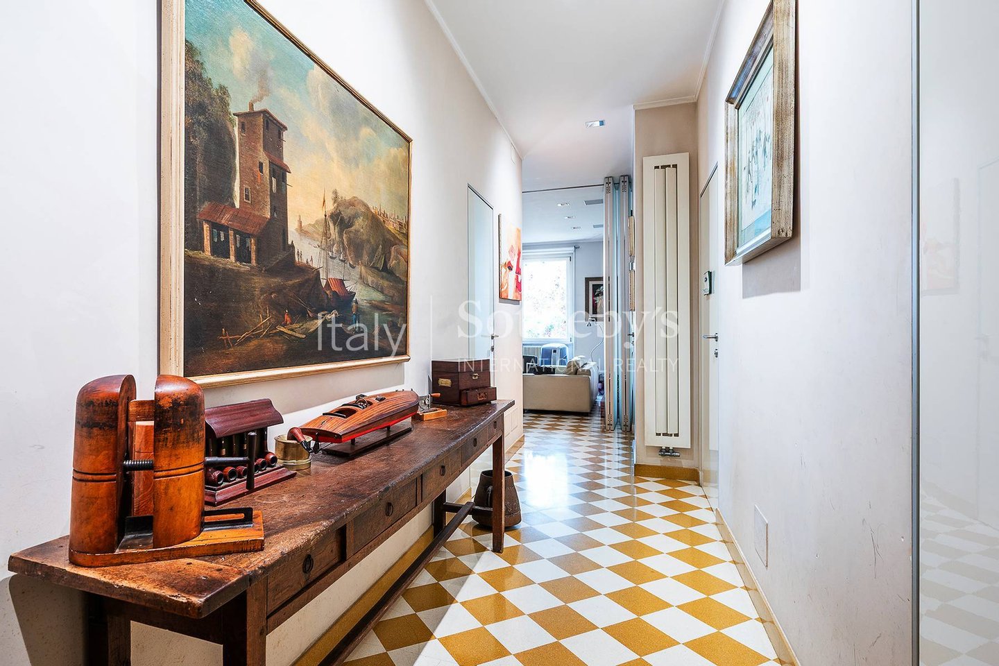 The living area opens harmoniously onto the garden, creating a seamless flow between the indoor and outdoor spaces. The contemporary Arclinea kitchen, complete with a central island, serves as the convivial heart of the home, complemented by a practical laundry room and a guest bathroom. A designer staircase leads to the upper floor, where bright and welcoming rooms include three bedrooms, a bathroom, and an elegant living room with large windows overlooking the garden, infusing the home with a serene and refined atmosphere.