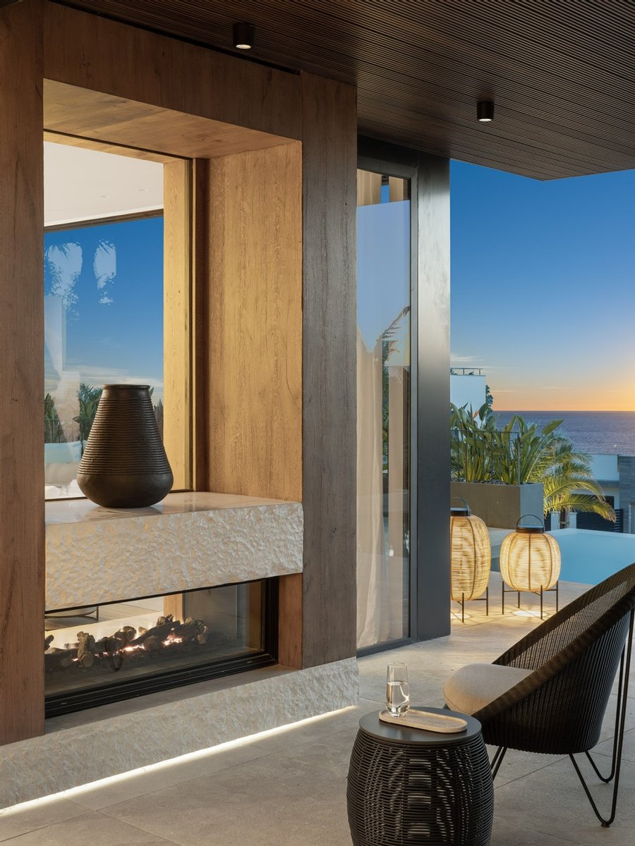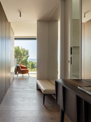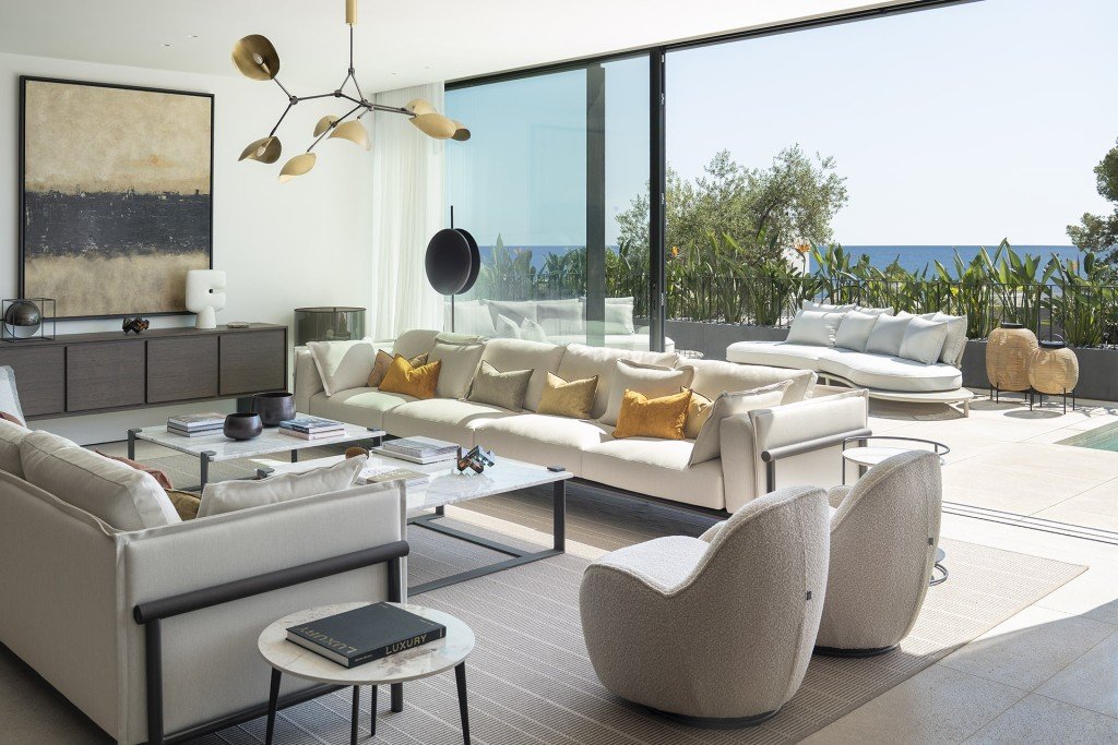 Beim Betreten empfängt Sie ein großzügiger, offener Wohnbereich, in dem raumhohe Glasflächen die Grenze zwischen Innenraum und mediterraner Landschaft auflösen. Der Innenraum besticht durch maßgeschneiderte Details, Natursteinelemente und hochwertige Beleuchtung – eine perfekte Harmonie zwischen Eleganz und Modernität.