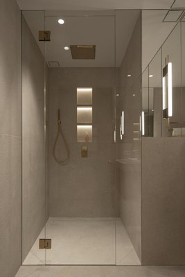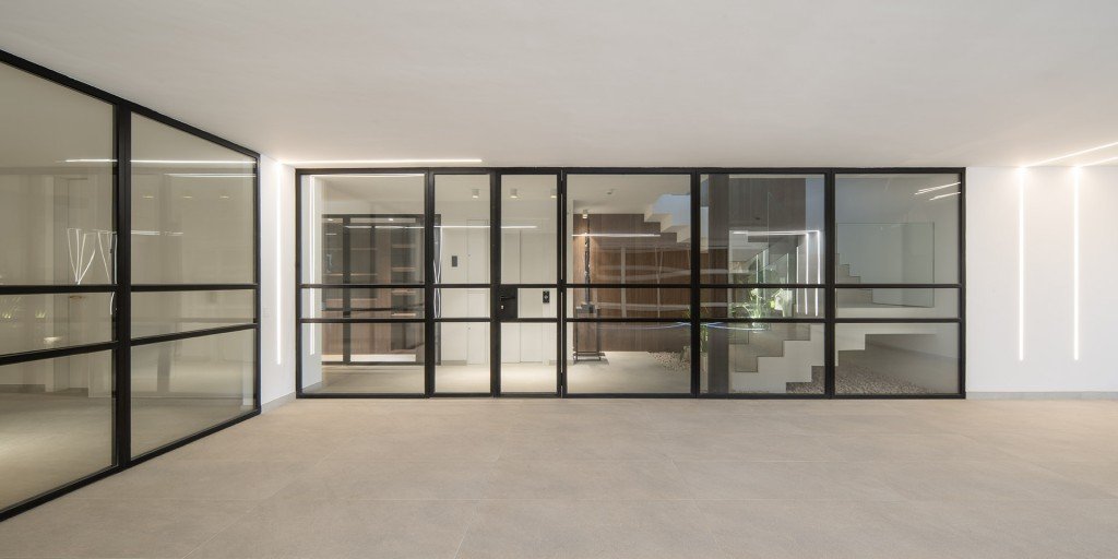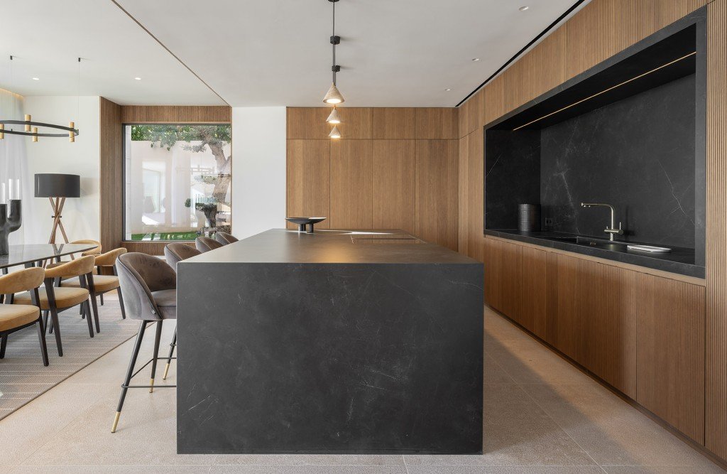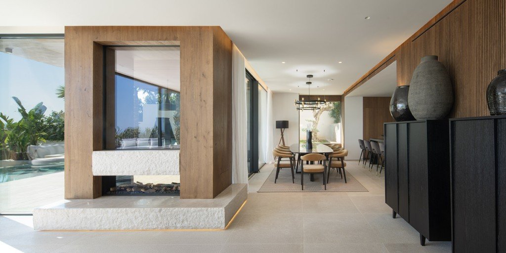Beim Betreten empfängt Sie ein großzügiger, offener Wohnbereich, in dem raumhohe Glasflächen die Grenze zwischen Innenraum und mediterraner Landschaft auflösen. Der Innenraum besticht durch maßgeschneiderte Details, Natursteinelemente und hochwertige Beleuchtung – eine perfekte Harmonie zwischen Eleganz und Modernität.
