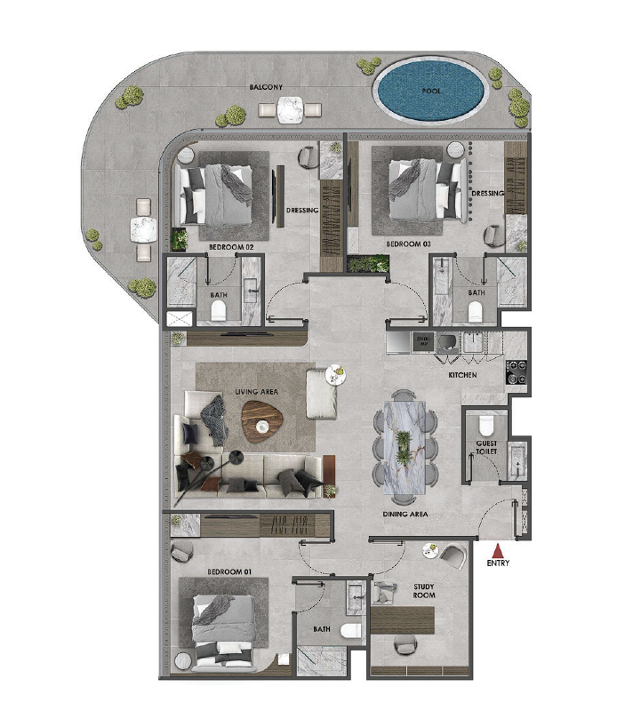 Luxuriöse 3-Zimmer-Wohnung mit privatem Pool auf dem Balkon