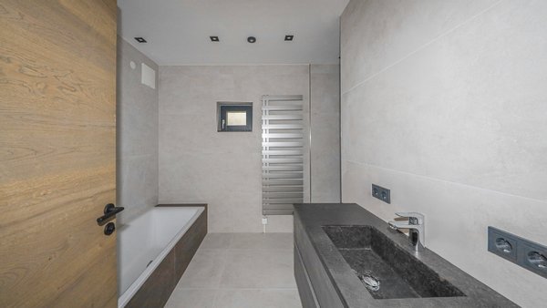Von hier erreicht man 2 weitere Schlafzimmer sowie ein Badezimmer mit Wanne, Dusche und Doppelwaschbecken. Ein getrenntes WC ist ebenfalls vorhanden. Vom Vorraum kommt man weiters in einen großen Keller/Wirtschaftsraum, der auch von außen zugänglich ist.