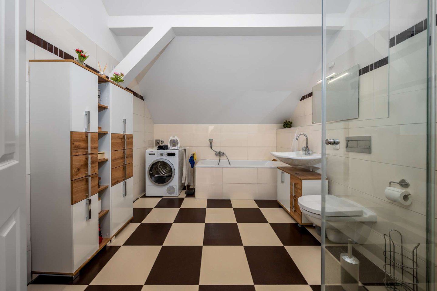 + Moderne Badausstattung: Das Badezimmer im Obergeschoss verfügt über eine Dusche, eine Badewanne und moderne, zeitlose Fliesen im Schachbrettmuster.