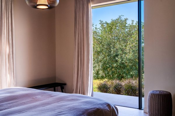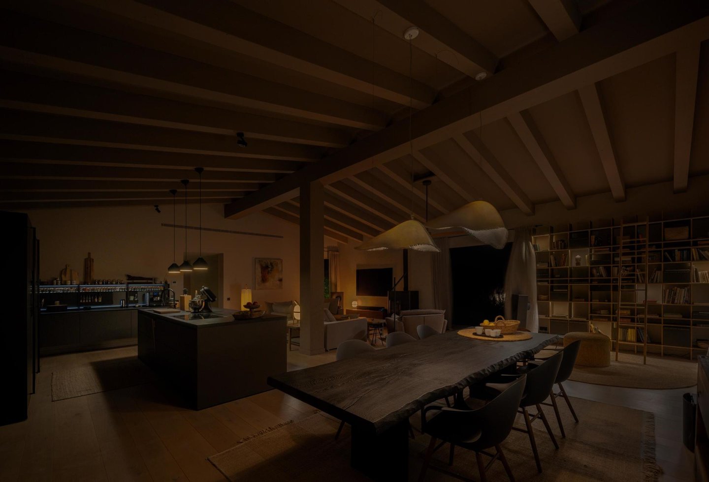Jedes Detail wurde in Konsequenz durchdacht – von den massiven Sichtbalken über die rahmenlosen, vollständig versenkbaren Panoramafenster bis hin zu den hochwertigen Eichendielen und Natursteinfliesen. Die Bäder sind mit Axor Hansgrohe Armaturen (Rainfinity) ausgestattet, das Masterbad zusätzlich mit einer Designer-Badewanne von Falper sowie einem Dusch-WC von Laufen
