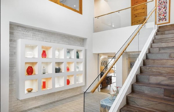 • Oberflächen aus antikem Travertin und Geländer aus gehärtetem Glas