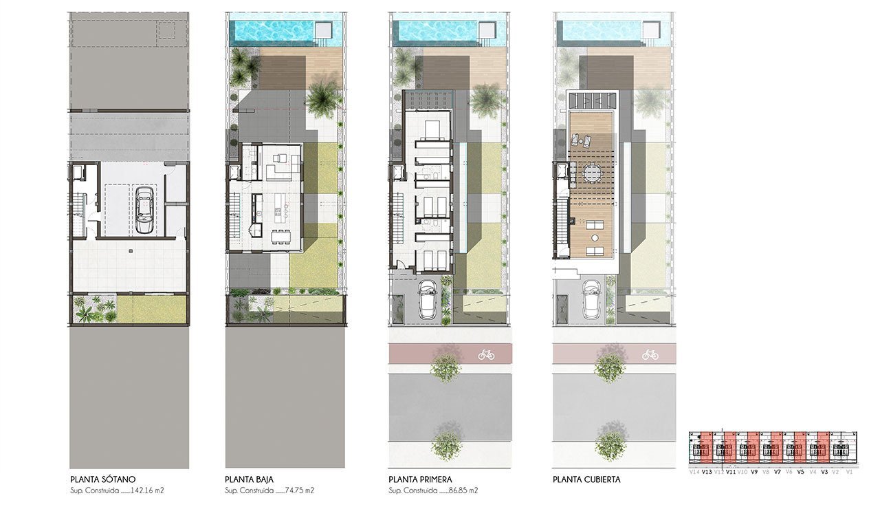Diese kleine Wohnanlage besteht aus 14 Doppelhaushälften mit jeweils 3 Etagen inklusive Keller, eigenen Stellplätzen im Keller und im Freien, privatem Pool, Innenhof (Patio), Terrassen und Dachterrasse. Die Häuser liegen in erster Linie am Golfplatz, bieten einen wunderschönen Ausblick aufs Grün und die großen Fenster sorgen für eine optimale Beleuchtung der Innenräume.
