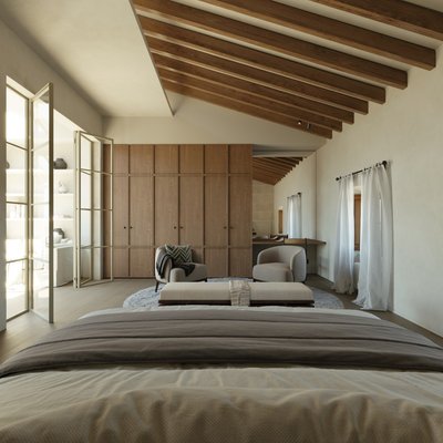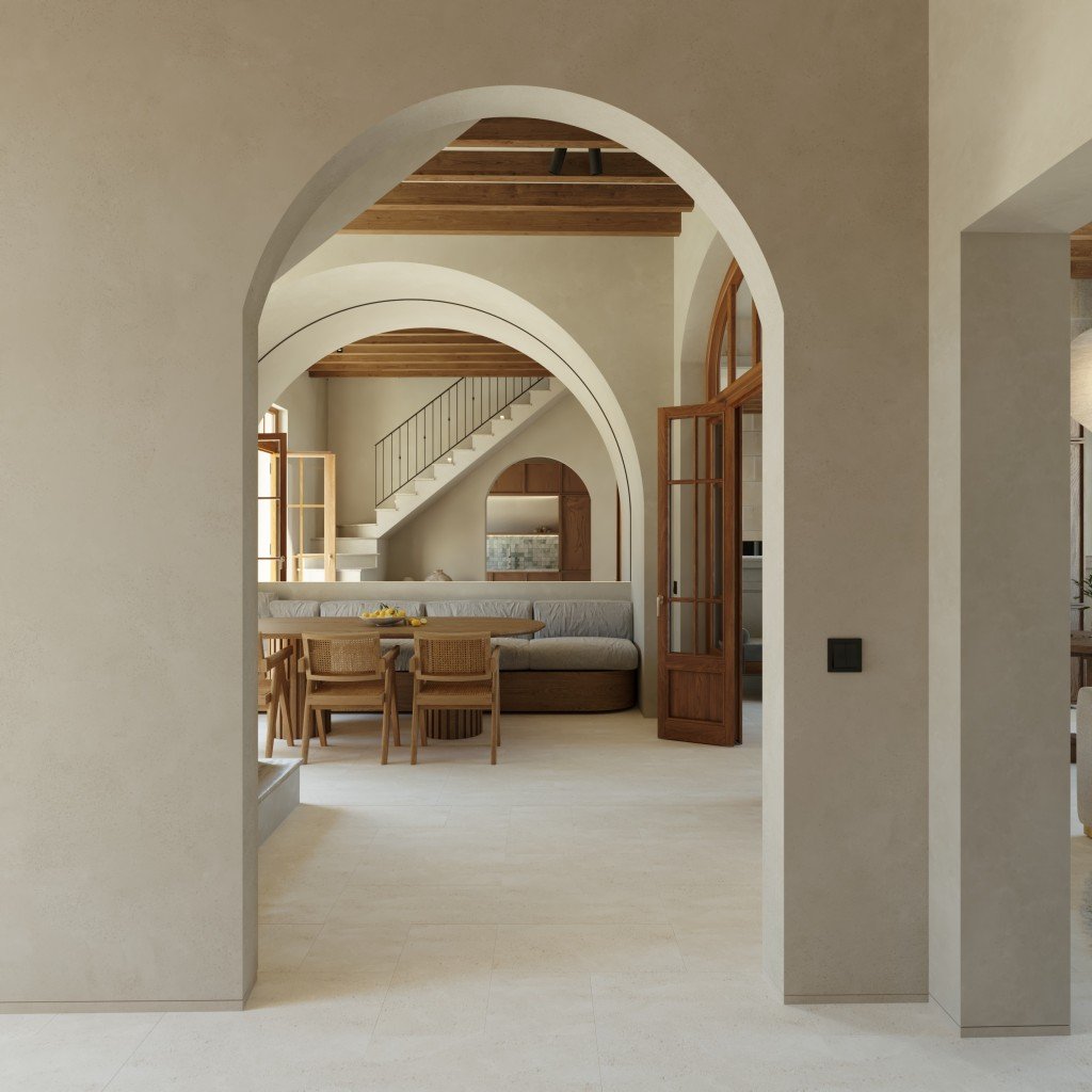 Die Immobilie verfügt über drei großzügige Doppelschlafzimmer und drei Badezimmer sowie eine private Terrasse mit freiem Blick, die zum Entspannen und Genießen der ruhigen Umgebung einlädt. Das Haus besticht durch einzigartige architektonische Elemente wie geschwungene Rundbögen, sichtbare Holzbalken, Steinakzente und maßgefertigte Holzmöbel, die ihm einen besonderen Charakter verleihen.