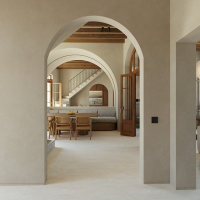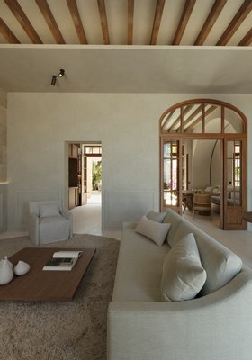 Die Immobilie verfügt über drei großzügige Doppelschlafzimmer und drei Badezimmer sowie eine private Terrasse mit freiem Blick, die zum Entspannen und Genießen der ruhigen Umgebung einlädt. Das Haus besticht durch einzigartige architektonische Elemente wie geschwungene Rundbögen, sichtbare Holzbalken, Steinakzente und maßgefertigte Holzmöbel, die ihm einen besonderen Charakter verleihen.