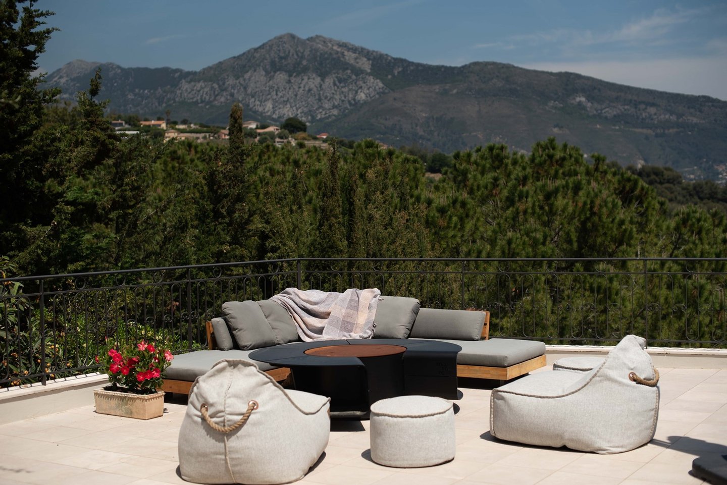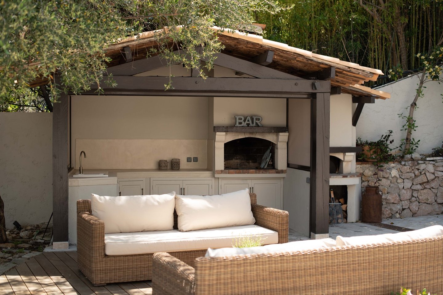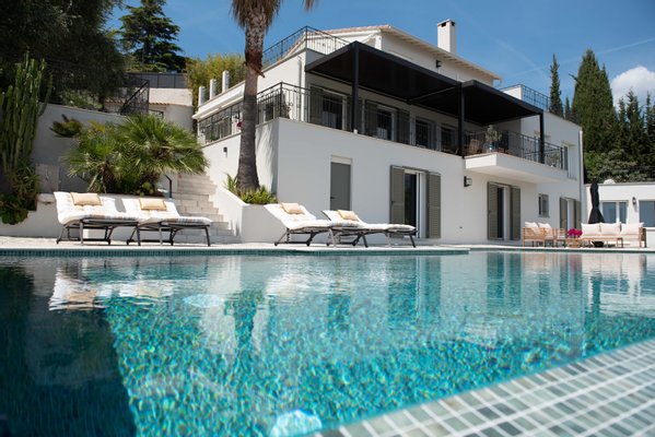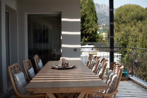 Die Terrassen wurden sorgfältig gestaltet, um jedem Bedarf und Anlass gerecht zu werden. Die *Pizzaterrasse* ist perfekt für Familienspaß, Spiele und die Zubereitung köstlicher hausgemachter Pizzen. Die *Familienterrasse* lädt zu einer schönen Zeit und herzlichen Gesprächen ein, während die erhöhte Terrasse mit Blick auf den Poolbereich sowohl Sonne als auch Schatten bietet - ideal für entspannte Abendessen, während Sie den Kindern beim Spielen im Pool zusehen und einen atemberaubenden Blick auf das Meer und die Berge genießen. Schließlich ist die *Abendterrasse*, die in das Licht des Sonnenuntergangs getaucht ist, der perfekte Rahmen für Cocktails und geselliges Beisammensein. Die Kombination aus sonnigen und schattigen Plätzen auf den Terrassen sorgt für ein ideales Wohnerlebnis im Freien in Südfrankreich.