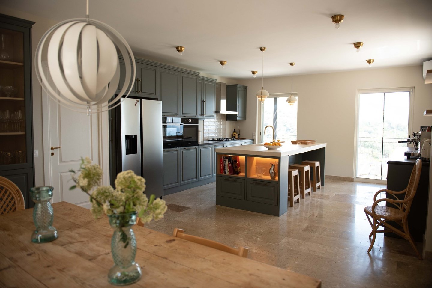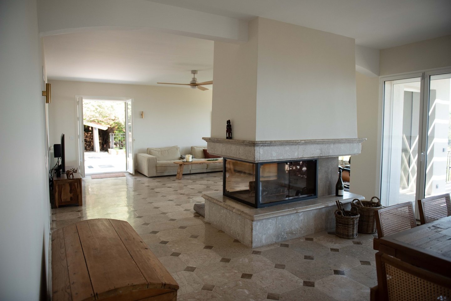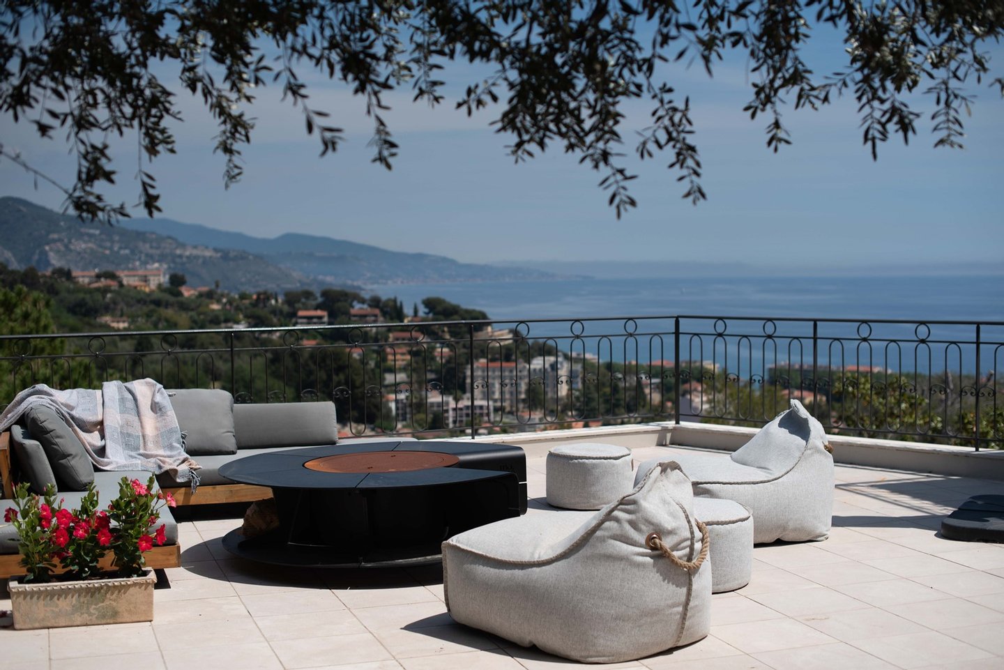 Die Terrassen wurden sorgfältig gestaltet, um jedem Bedarf und Anlass gerecht zu werden. Die *Pizzaterrasse* ist perfekt für Familienspaß, Spiele und die Zubereitung köstlicher hausgemachter Pizzen. Die *Familienterrasse* lädt zu einer schönen Zeit und herzlichen Gesprächen ein, während die erhöhte Terrasse mit Blick auf den Poolbereich sowohl Sonne als auch Schatten bietet - ideal für entspannte Abendessen, während Sie den Kindern beim Spielen im Pool zusehen und einen atemberaubenden Blick auf das Meer und die Berge genießen. Schließlich ist die *Abendterrasse*, die in das Licht des Sonnenuntergangs getaucht ist, der perfekte Rahmen für Cocktails und geselliges Beisammensein. Die Kombination aus sonnigen und schattigen Plätzen auf den Terrassen sorgt für ein ideales Wohnerlebnis im Freien in Südfrankreich.