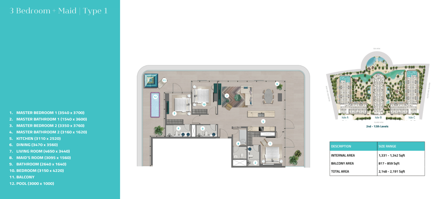 Willkommen in Ihrem neuen Zuhause - eine geräumige 3-Zimmer-Wohnung mit privatem Pool und separatem Zimmer für Ihre Hausangestellten. Treten Sie ein und lassen Sie sich von den zahlreichen Annehmlichkeiten dieser luxuriösen Immobilie verzaubern.