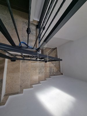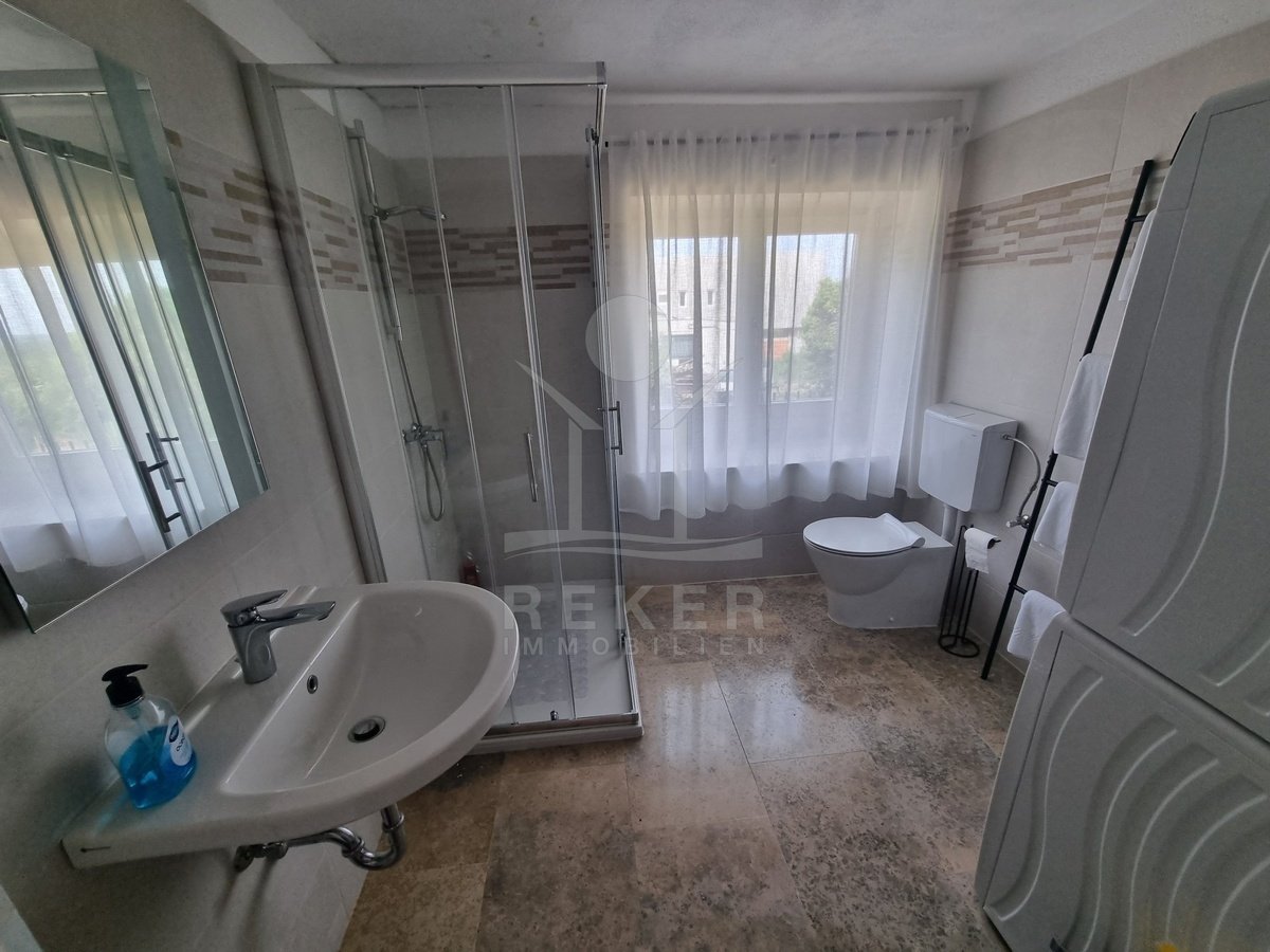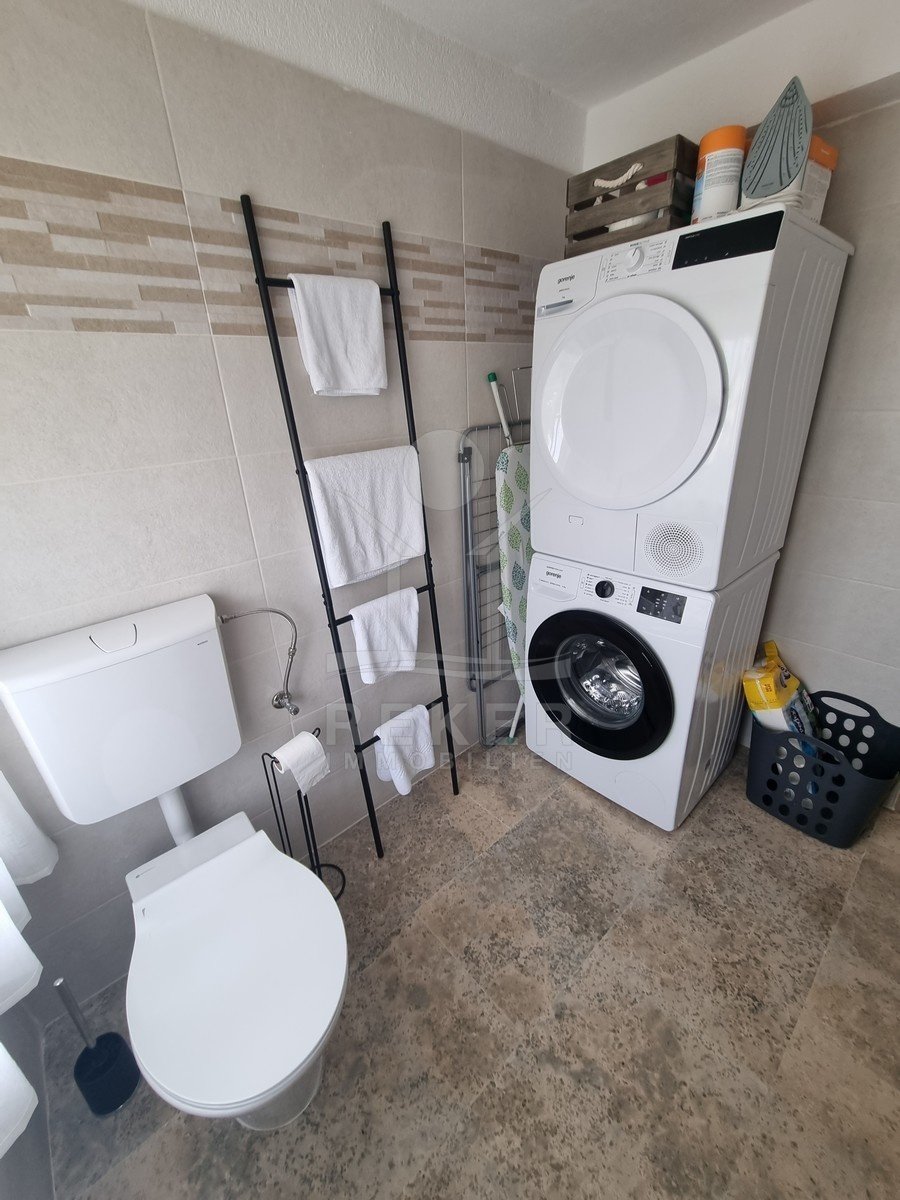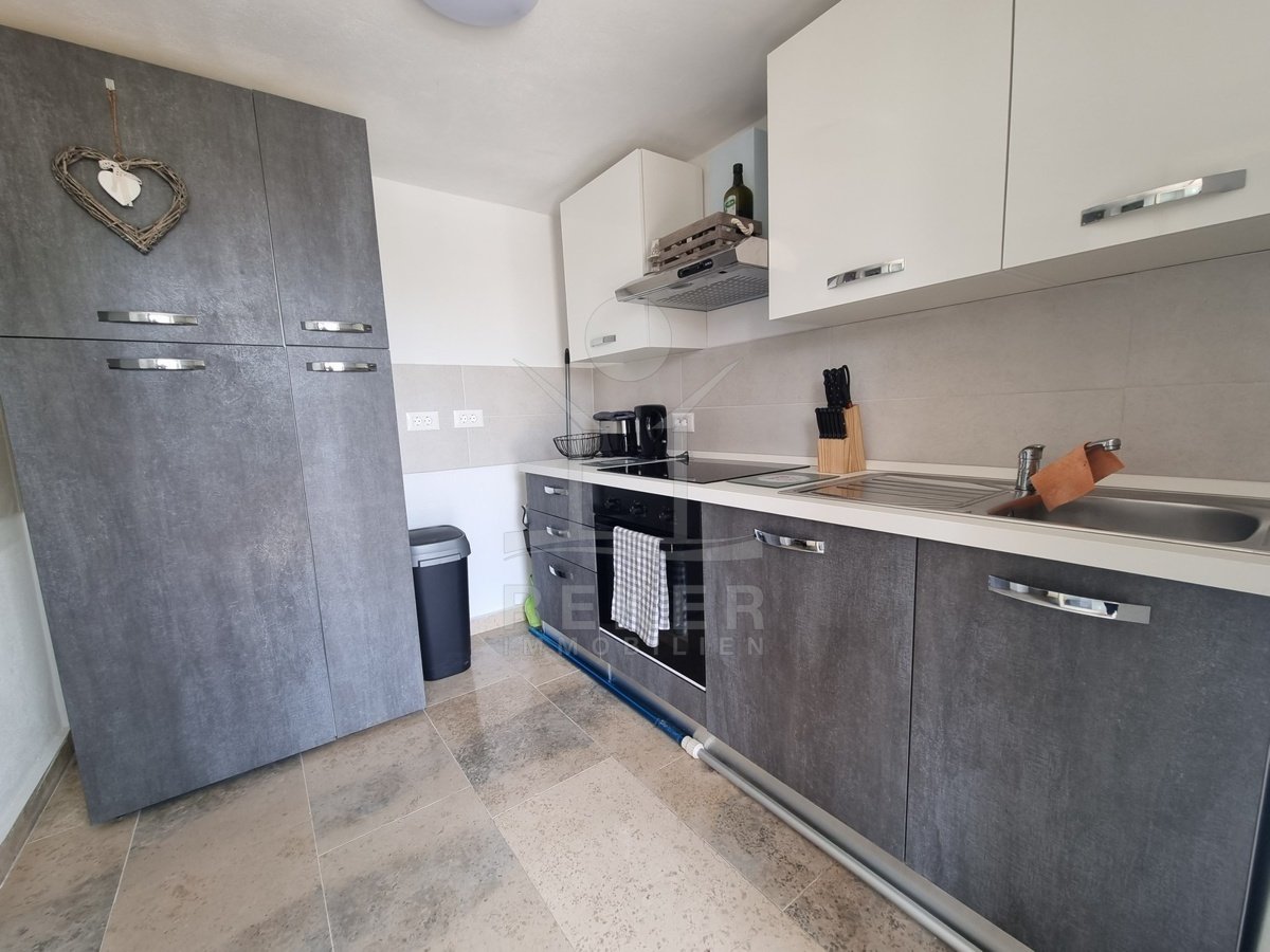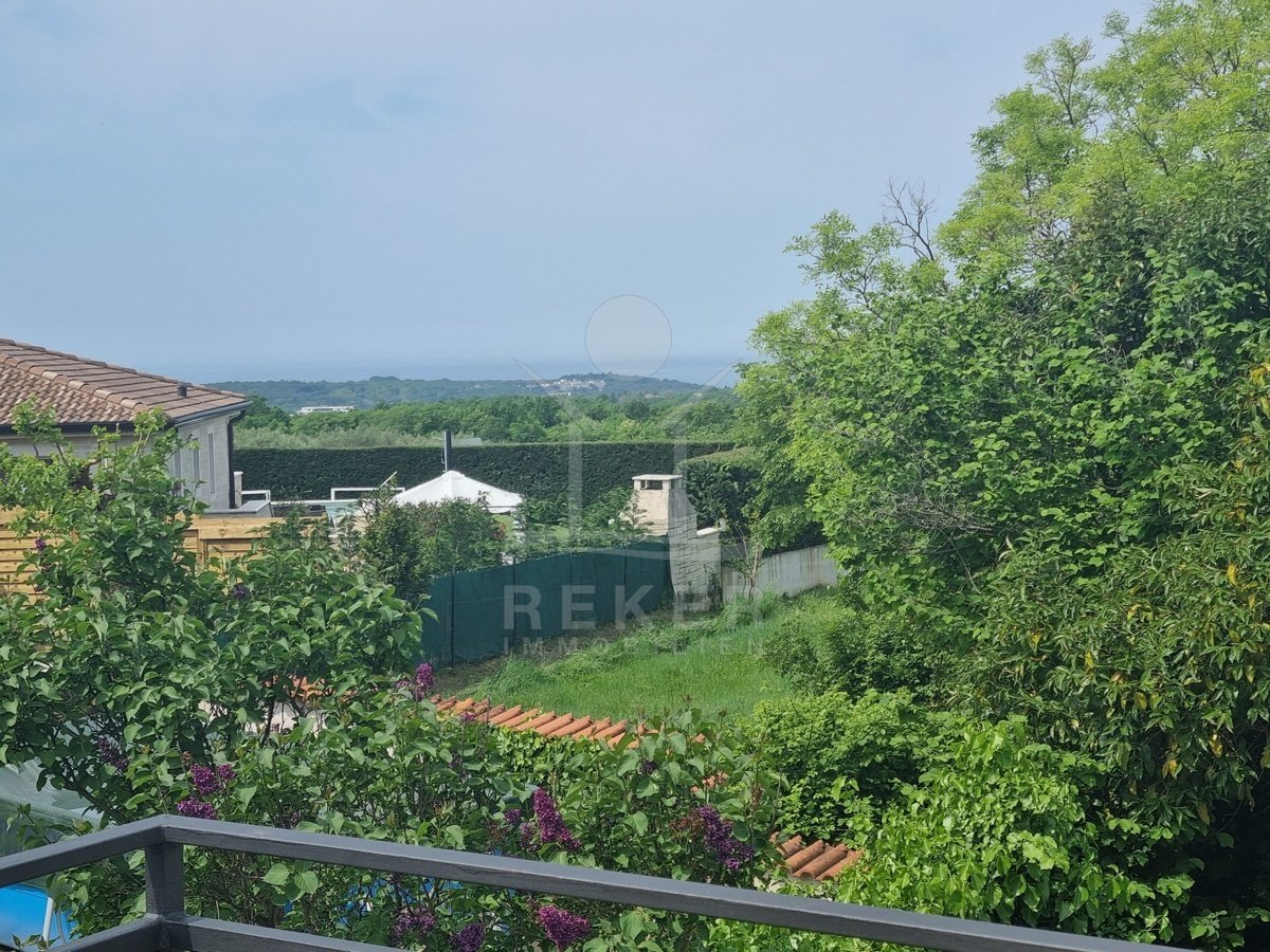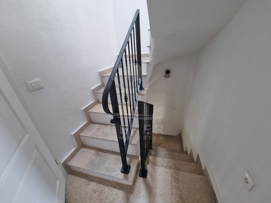 Das Grundstück misst 312 m², mit einem Gartenanteil von rund 219 m² – und dieser Platz wird richtig genutzt. Im Mittelpunkt: der eigene Swimmingpool. Gleich daneben eine überdachte Außenküche mit Steingrill. Ideal für lange Sommerabende mit Familie oder Freunden. Besonders schön ist auch der große Balkon im Obergeschoss. Er bietet nicht nur Platz, sondern auch freien Blick aufs Meer – und verbindet per Treppe direkt den Garten und den Schlafbereich. Die Legalisierung von Pool und Terrassenteil ist beantragt, hoffentlich wird bis Ende des Jahres 2025 entschieden.