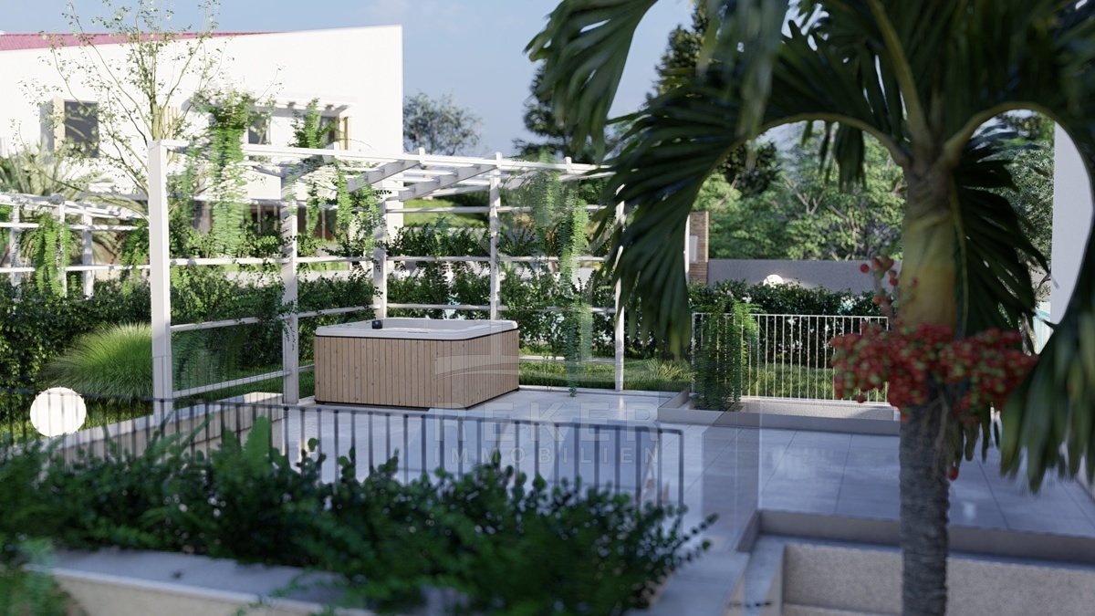 Draußen gibt es gleich mehrere Orte zum Verweilen. Eine überdachte Terrasse mit Außenküche – perfekt für lange Sommerabende. Ein kleiner, privater Terrassenbereich am Schlafzimmer im Erdgeschoss. Und oben: ein riesiger Balkon mit Whirlpool. Hier wird’s besonders – mit Blick ins Grüne, Ruhe und dem gewissen Extra. Insgesamt stehen über 70 Quadratmeter Balkonfläche zur Verfügung. Dazu: Sicherheitstechnik, gepflegtes Grundstück, viele Rückzugsorte.