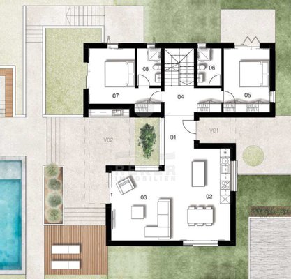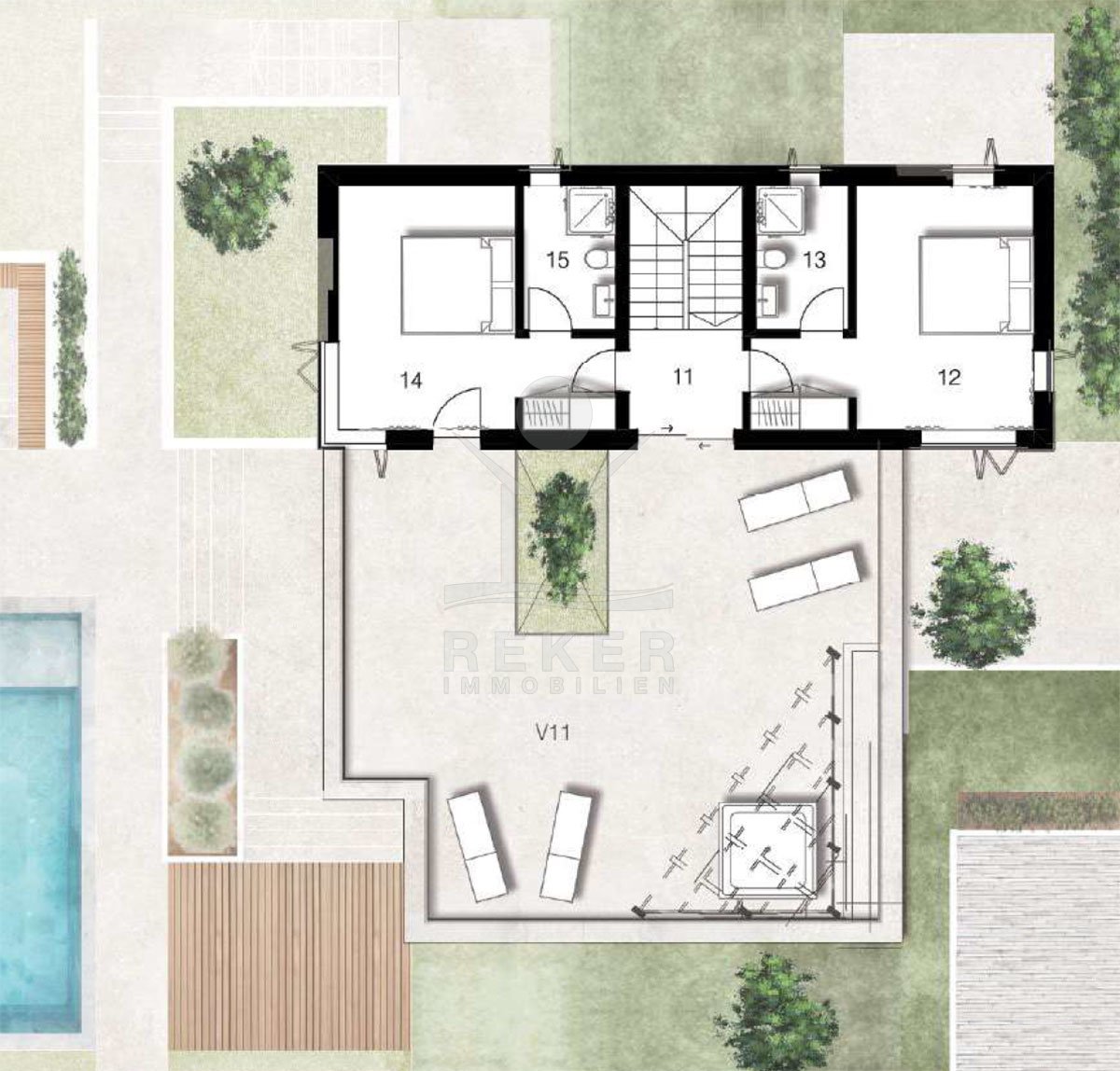 Im Garten: ein 8x4 Meter großer Pool mit viel Platz für Sonnenliegen. Gleich daneben: eine überdachte Terrasse mit Außenküche – perfekt für laue Abende oder entspannte Mittagessen. Oben auf dem großen Balkon erwartet Sie ein Whirlpool mit Aussicht. Hier lässt sich der Tag ruhig ausklingen. Insgesamt fast 100 m² an Außenflächen bieten reichlich Platz für alle – zum Entspannen, Spielen oder Zusammensein.