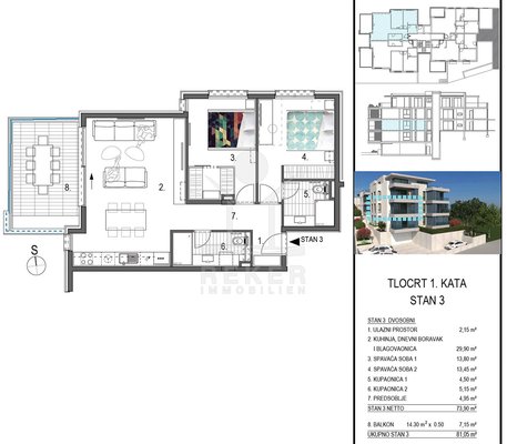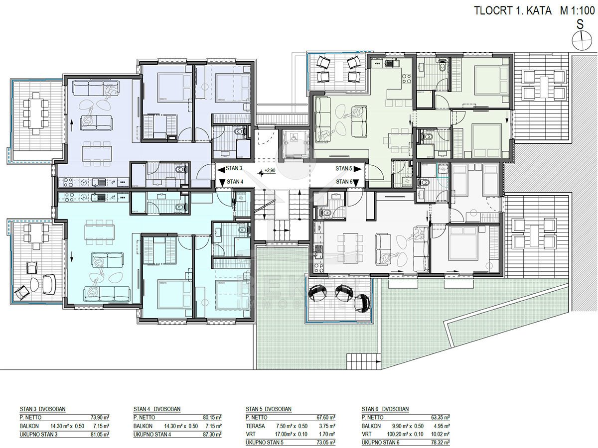 Klare, moderne Architektur: insgesamt entstehen zwölf Wohnungen, verteilt auf vier Etagen – Erdgeschoss bis dritte Stock. Ein Aufzug sorgt für barrierearmen Zugang auf allen Ebenen. Draußen erwartet Sie ein gemeinschaftlicher Pool – ideal für entspannte Stunden unter freiem Himmel. Für jedes Apartment ist ein Stellplatz vorgesehen. Kurz gesagt: alles da, was das Wohnen angenehm macht.