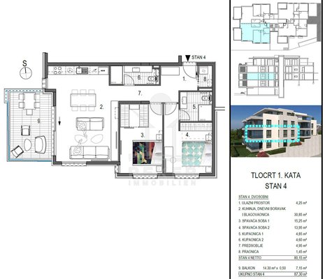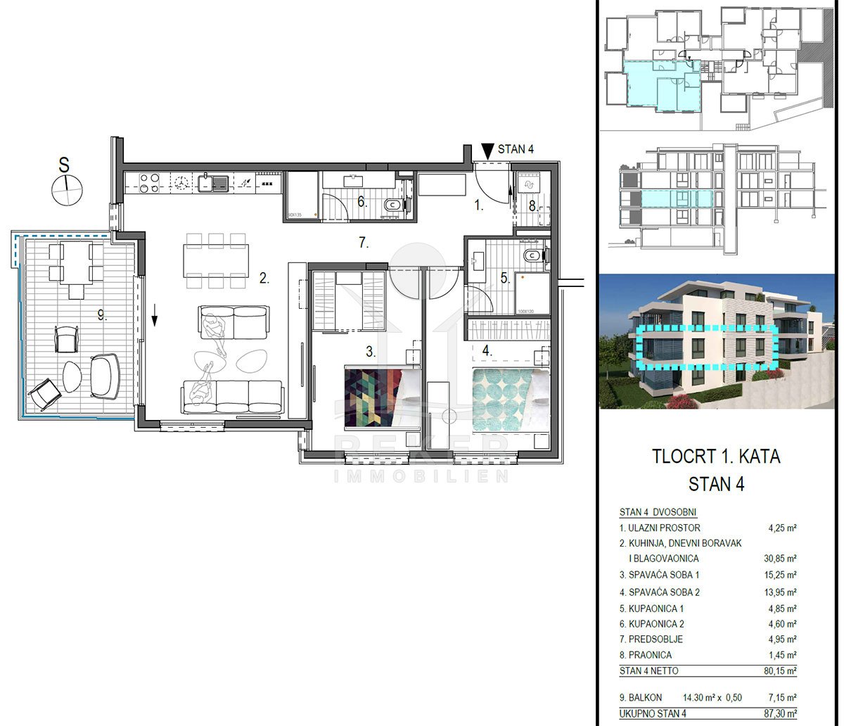 Klare, moderne Architektur: insgesamt entstehen zwölf Wohnungen, verteilt auf vier Etagen – Erdgeschoss bis dritte Stock. Ein Aufzug sorgt für barrierearmen Zugang auf allen Ebenen. Draußen erwartet Sie ein gemeinschaftlicher Pool – ideal für entspannte Stunden unter freiem Himmel. Für jedes Apartment ist ein Stellplatz vorgesehen. Kurz gesagt: alles da, was das Wohnen angenehm macht.