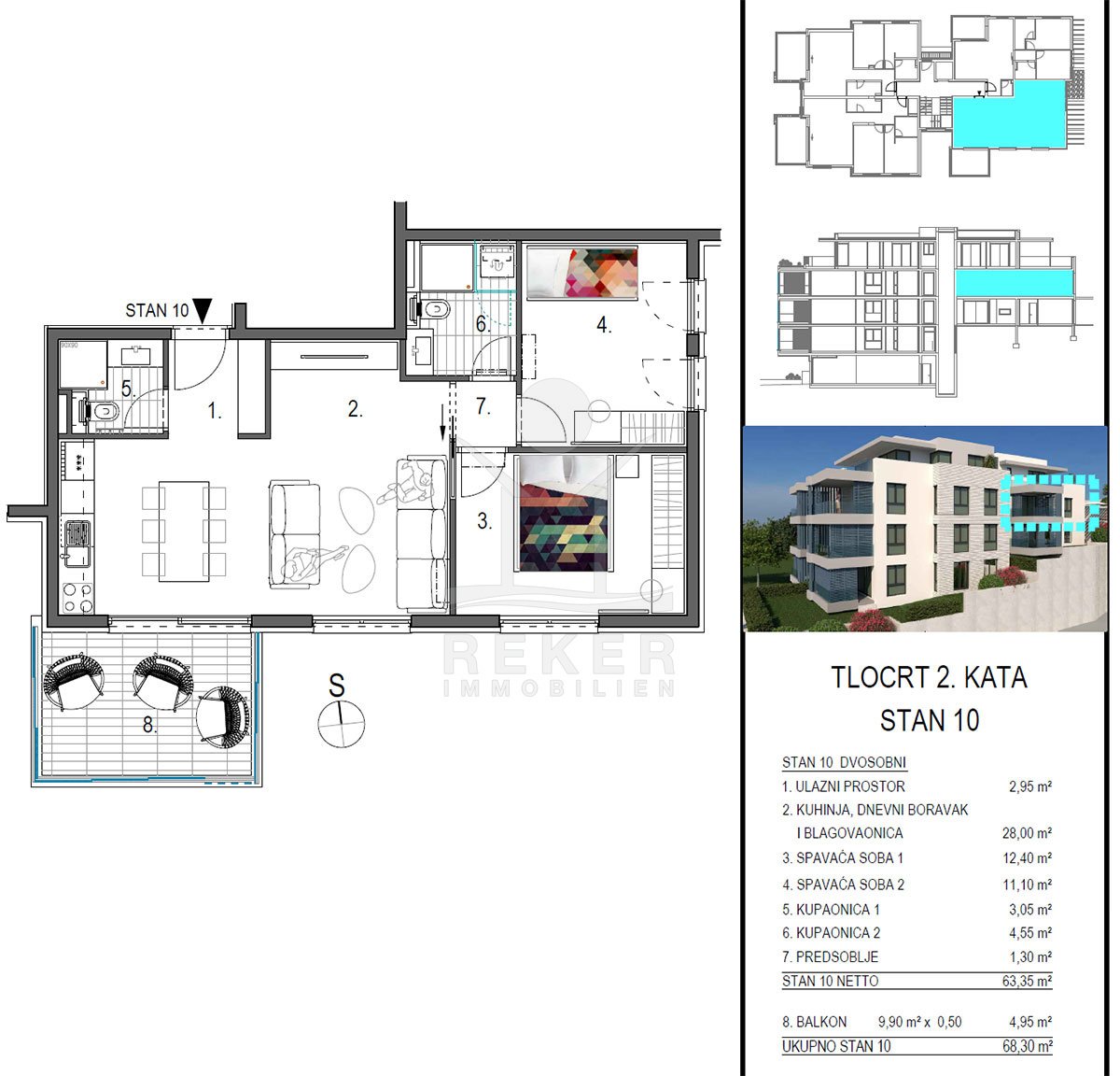 Klare, moderne Architektur: insgesamt entstehen zwölf Wohnungen, verteilt auf vier Etagen – Erdgeschoss bis dritte Stock. Ein Aufzug sorgt für barrierearmen Zugang auf allen Ebenen. Draußen erwartet Sie ein gemeinschaftlicher Pool – ideal für entspannte Stunden unter freiem Himmel. Für jedes Apartment ist ein Stellplatz vorgesehen. Kurz gesagt: alles da, was das Wohnen angenehm macht.