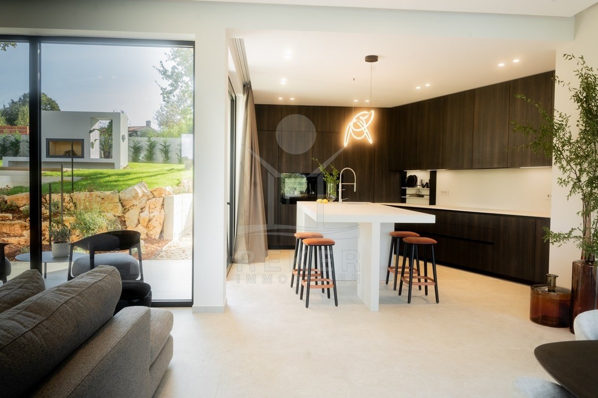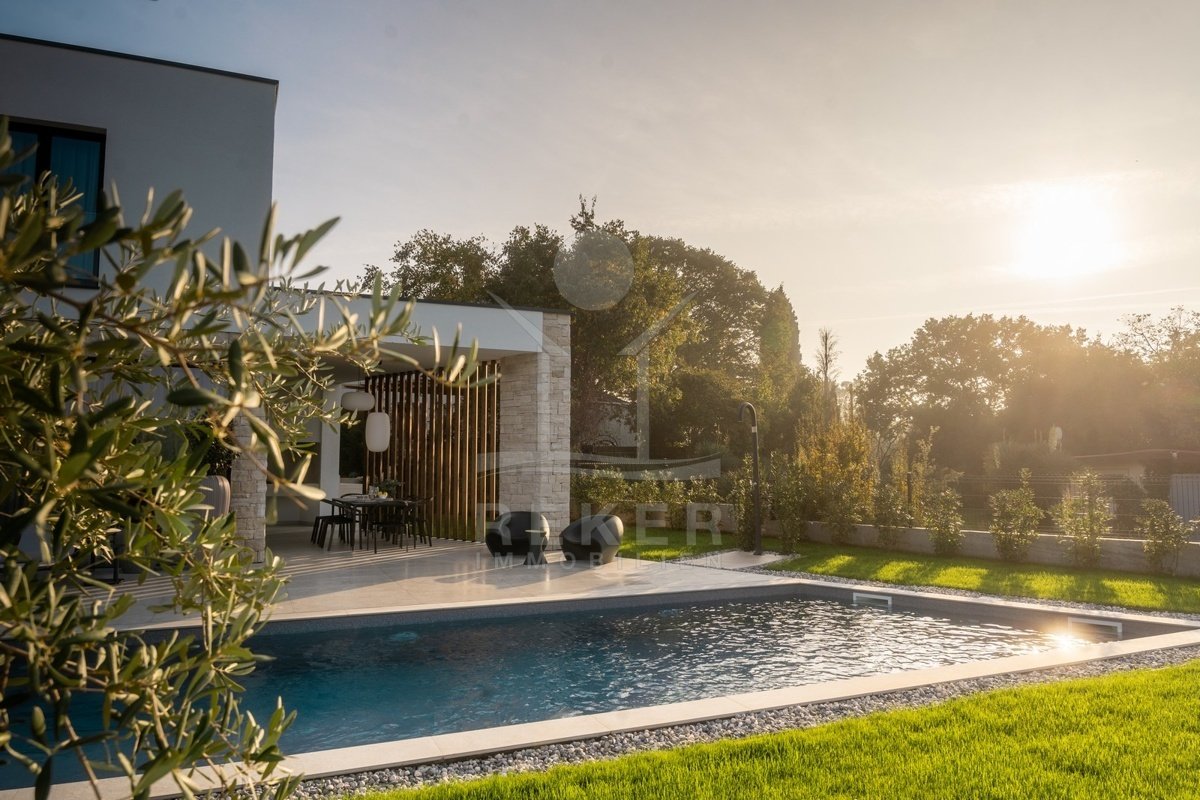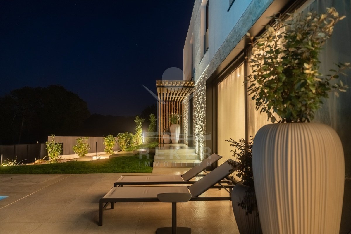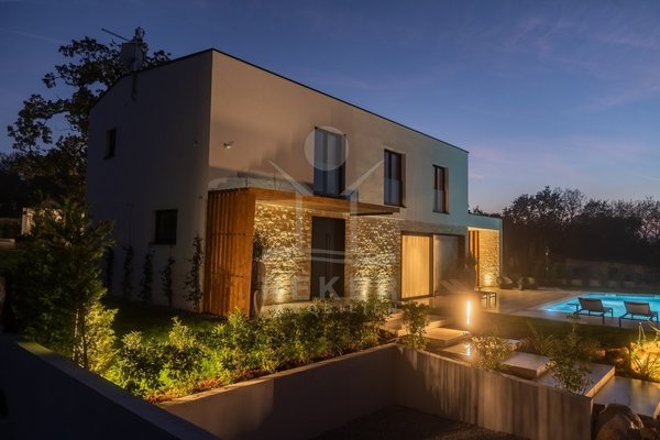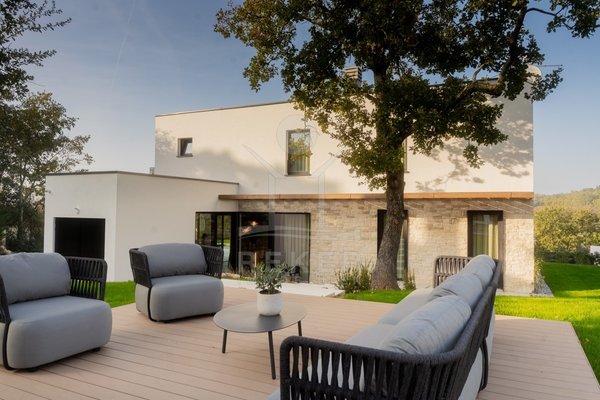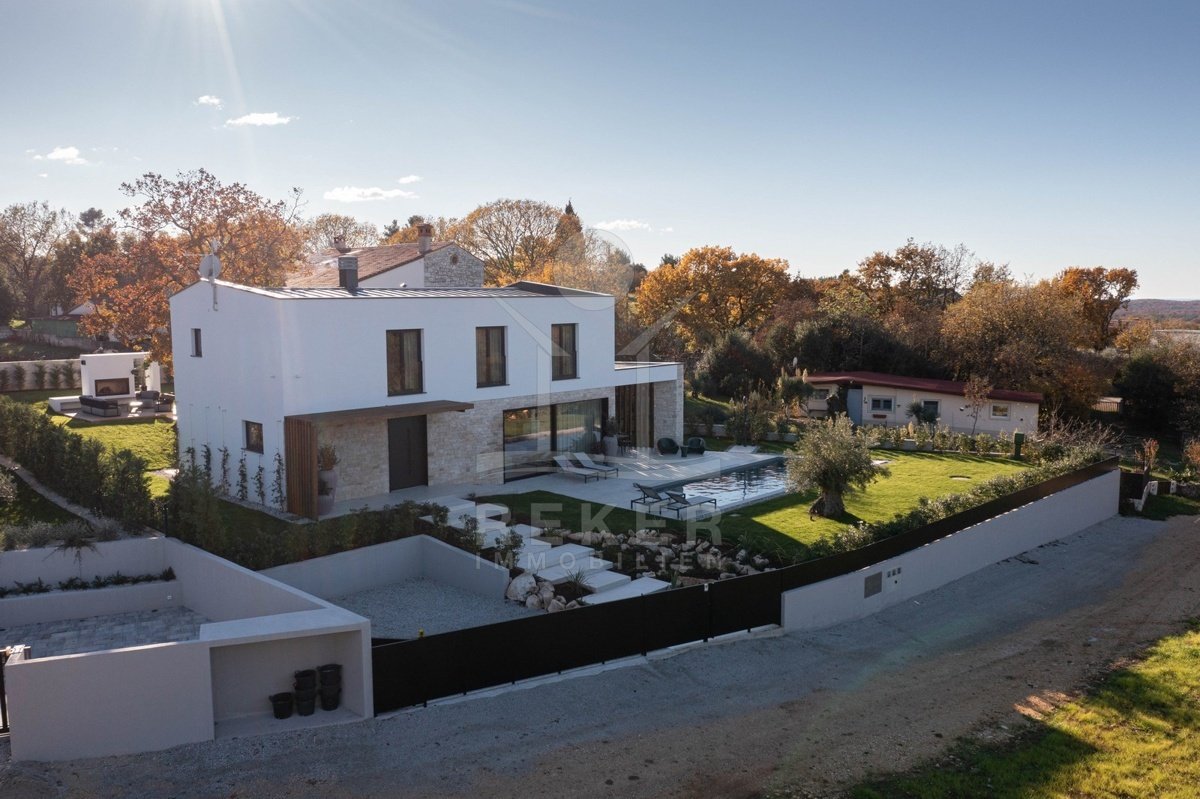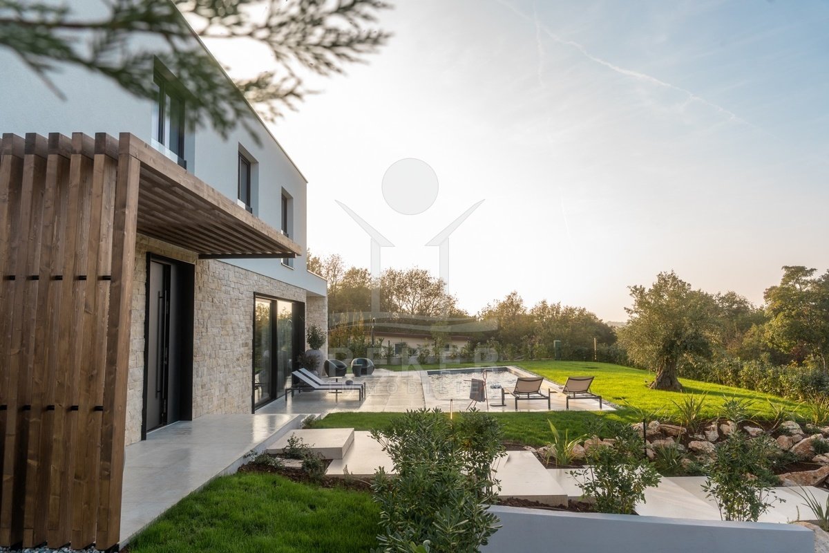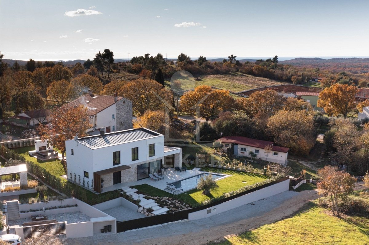 Zwischen Olivenhainen, Wäldern und kleinen Dörfern liegt dieses moderne Haus an der Westküste Istriens. Abseits vom Trubel und doch in erreichbarer Nähe zu Orten wie Poreč, Vrsar und Rovinj. Nur 8 Kilometer trennen Sie vom Meer. Das Grundstück liegt ruhig am Dorfrand – ohne Durchgangsverkehr, ohne direkte Nachbarbebauung. Ideal, wenn Sie das Besondere suchen: Natur, Ruhe, ein freier Blick und die Sicherheit, dass es so bleibt.