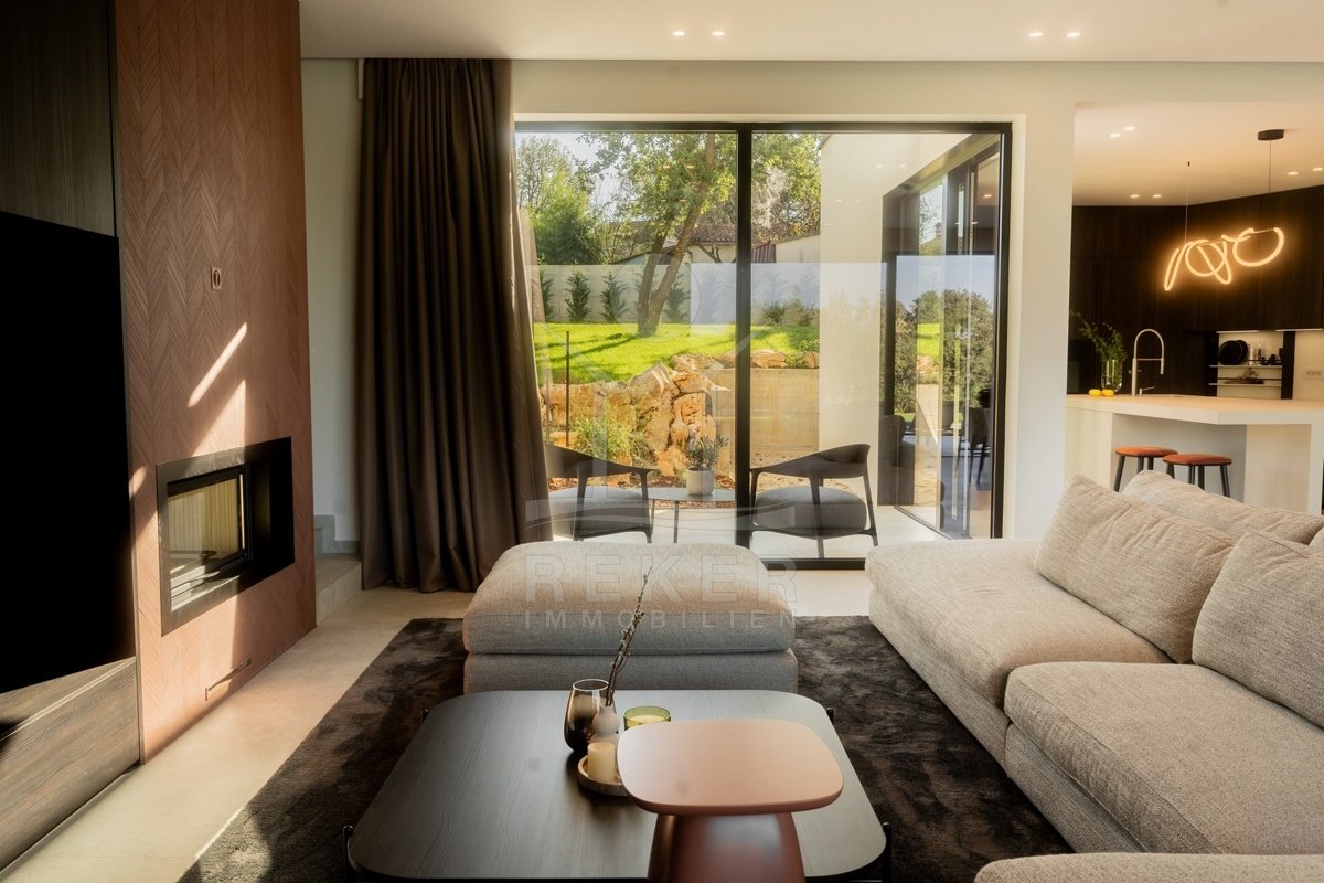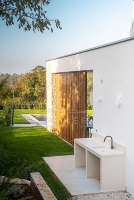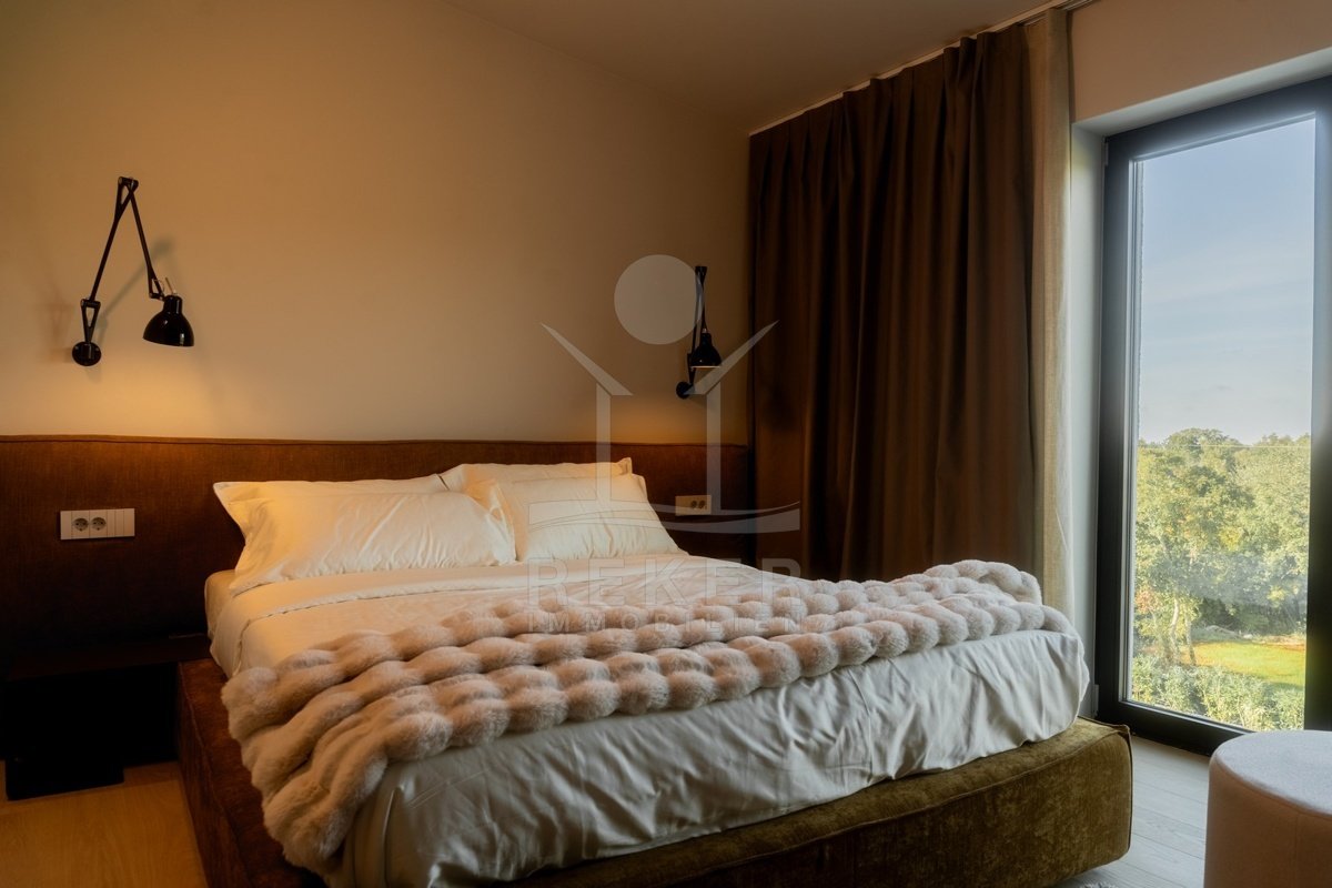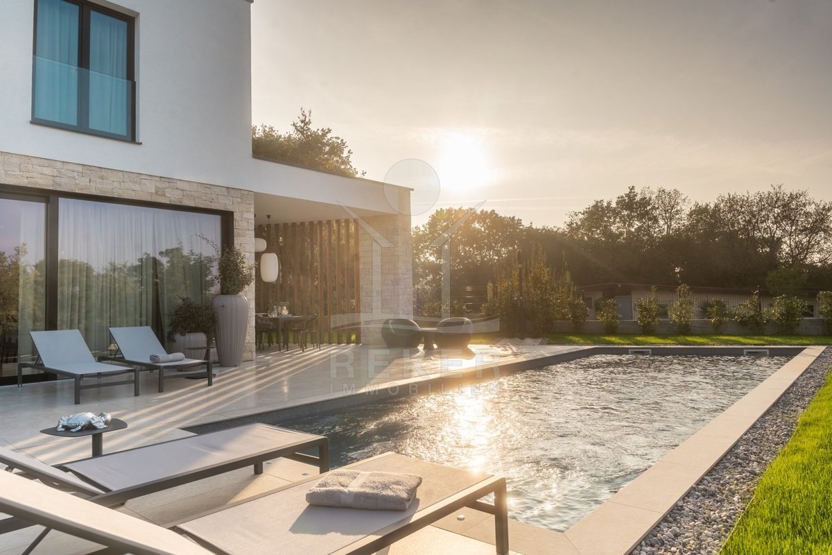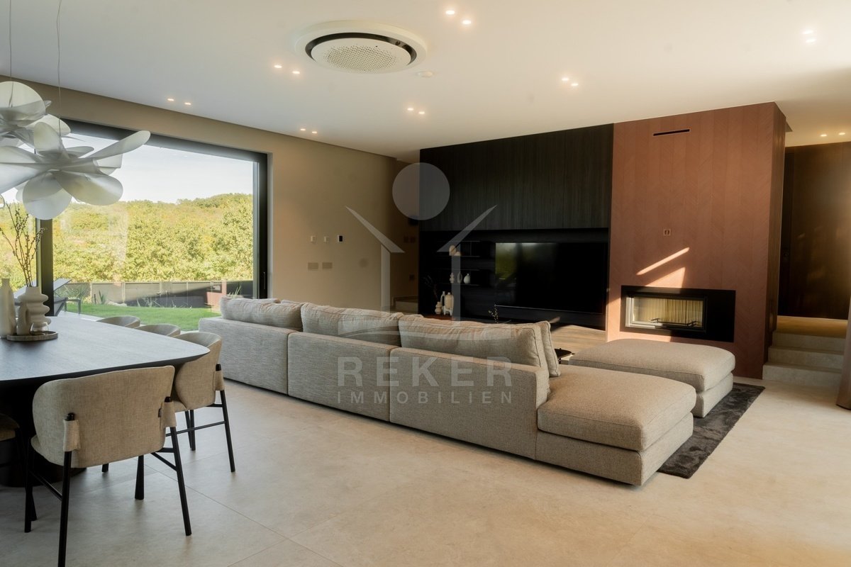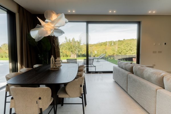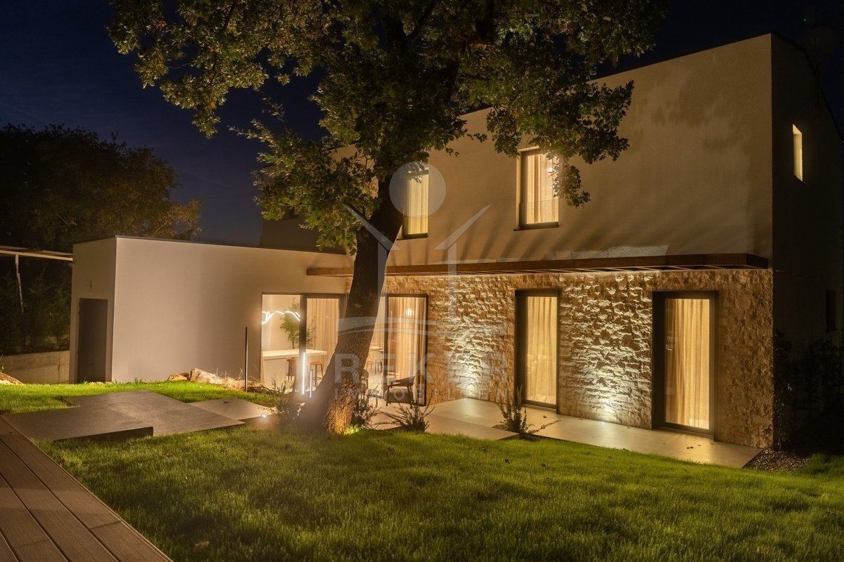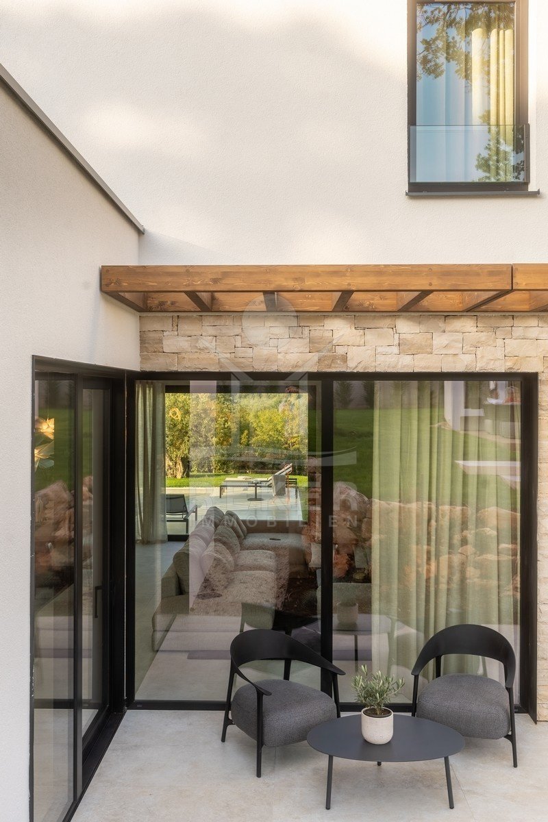 Zwischen Olivenhainen, Wäldern und kleinen Dörfern liegt dieses moderne Haus an der Westküste Istriens. Abseits vom Trubel und doch in erreichbarer Nähe zu Orten wie Poreč, Vrsar und Rovinj. Nur 8 Kilometer trennen Sie vom Meer. Das Grundstück liegt ruhig am Dorfrand – ohne Durchgangsverkehr, ohne direkte Nachbarbebauung. Ideal, wenn Sie das Besondere suchen: Natur, Ruhe, ein freier Blick und die Sicherheit, dass es so bleibt.