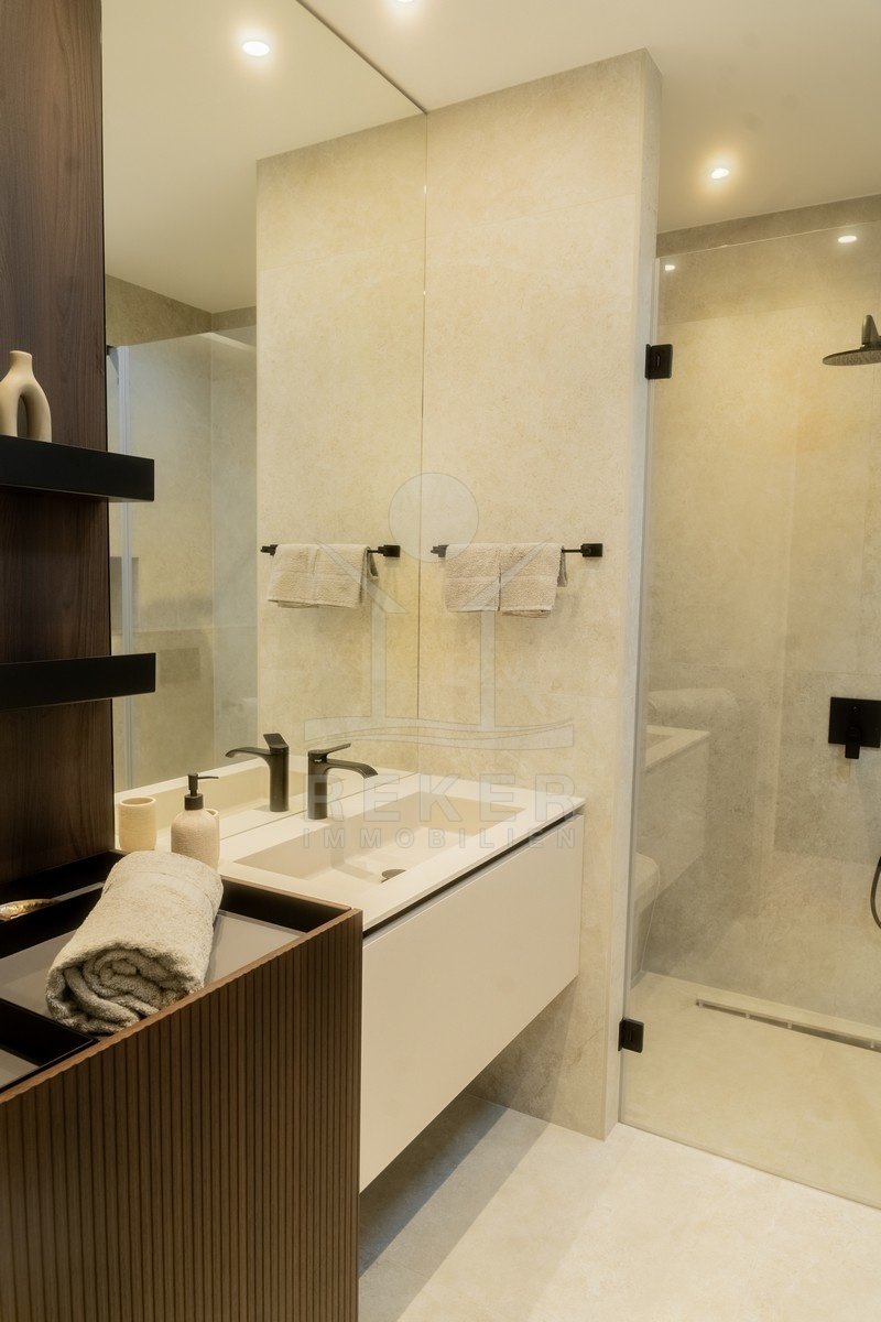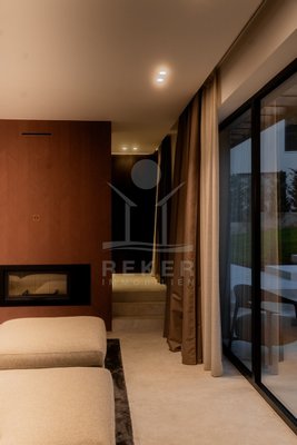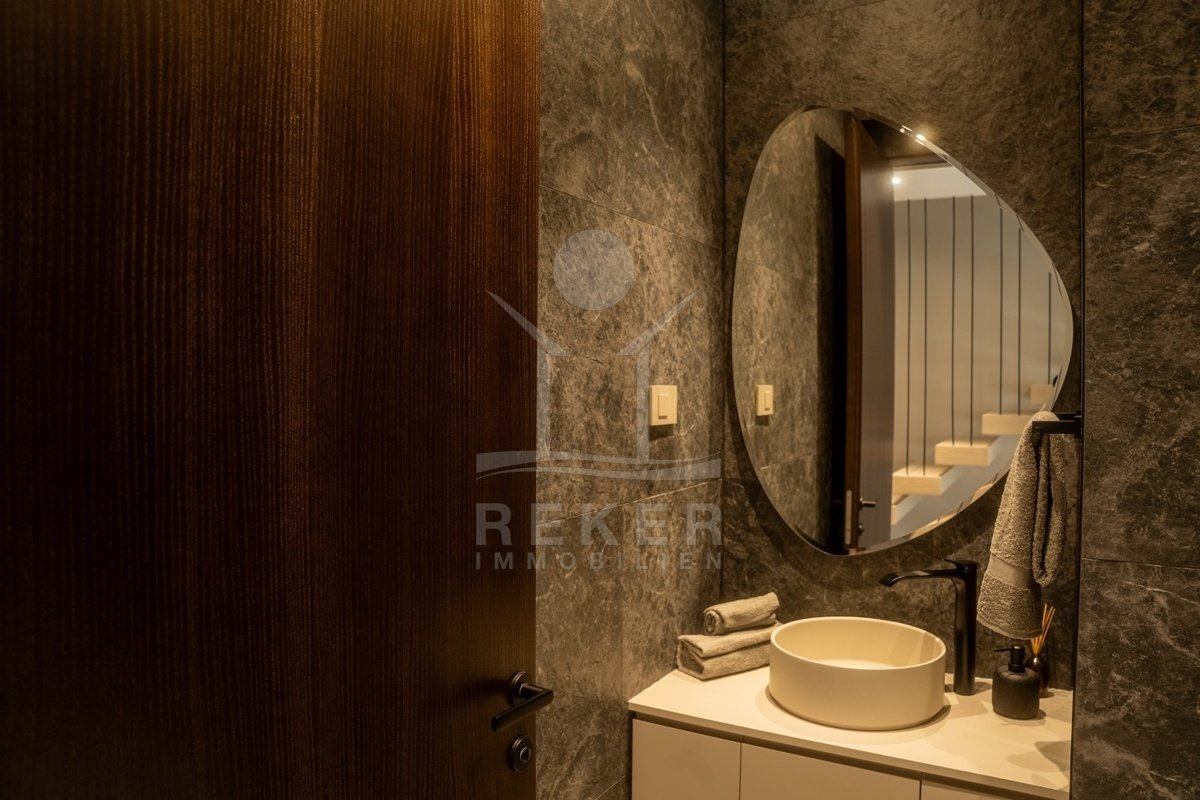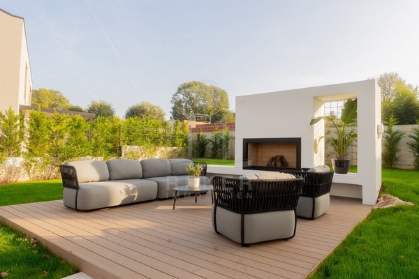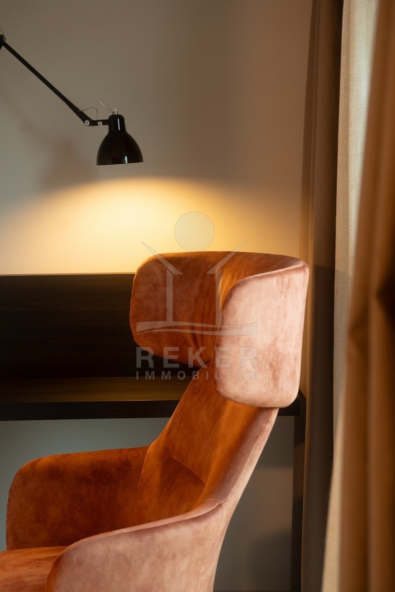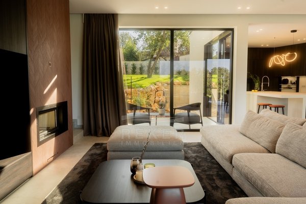 Draußen geht es genauso exklusiv weiter. Ein beheizbarer Pool mit Massage-Düsen und stimmungsvollem Licht wartet auf Sie. Daneben: eine Designer-Lounge mit offenem Kamin für lange Abende im Freien. Die Grillterrasse ist überdacht und voll ausgestattet – inklusive Gasgrill, Wasseranschluss und Arbeitsfläche. Hochwertige Gartenmöbel, sorgfältige Bepflanzung und Platz zum Zurückziehen machen den Außenbereich zum Wohnzimmer unter freiem Himmel. Für viele: der eigentliche Luxus.