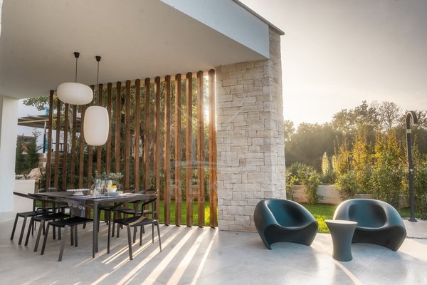 Zwischen Olivenhainen, Wäldern und kleinen Dörfern liegt dieses moderne Haus an der Westküste Istriens. Abseits vom Trubel und doch in erreichbarer Nähe zu Orten wie Poreč, Vrsar und Rovinj. Nur 8 Kilometer trennen Sie vom Meer. Das Grundstück liegt
