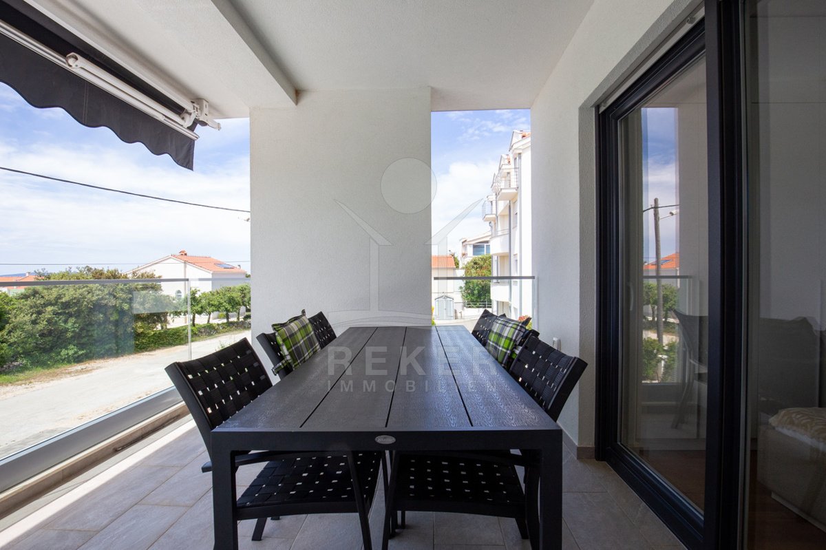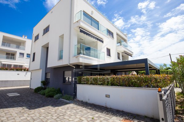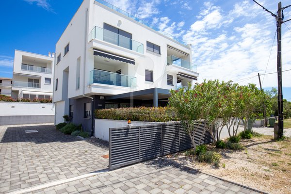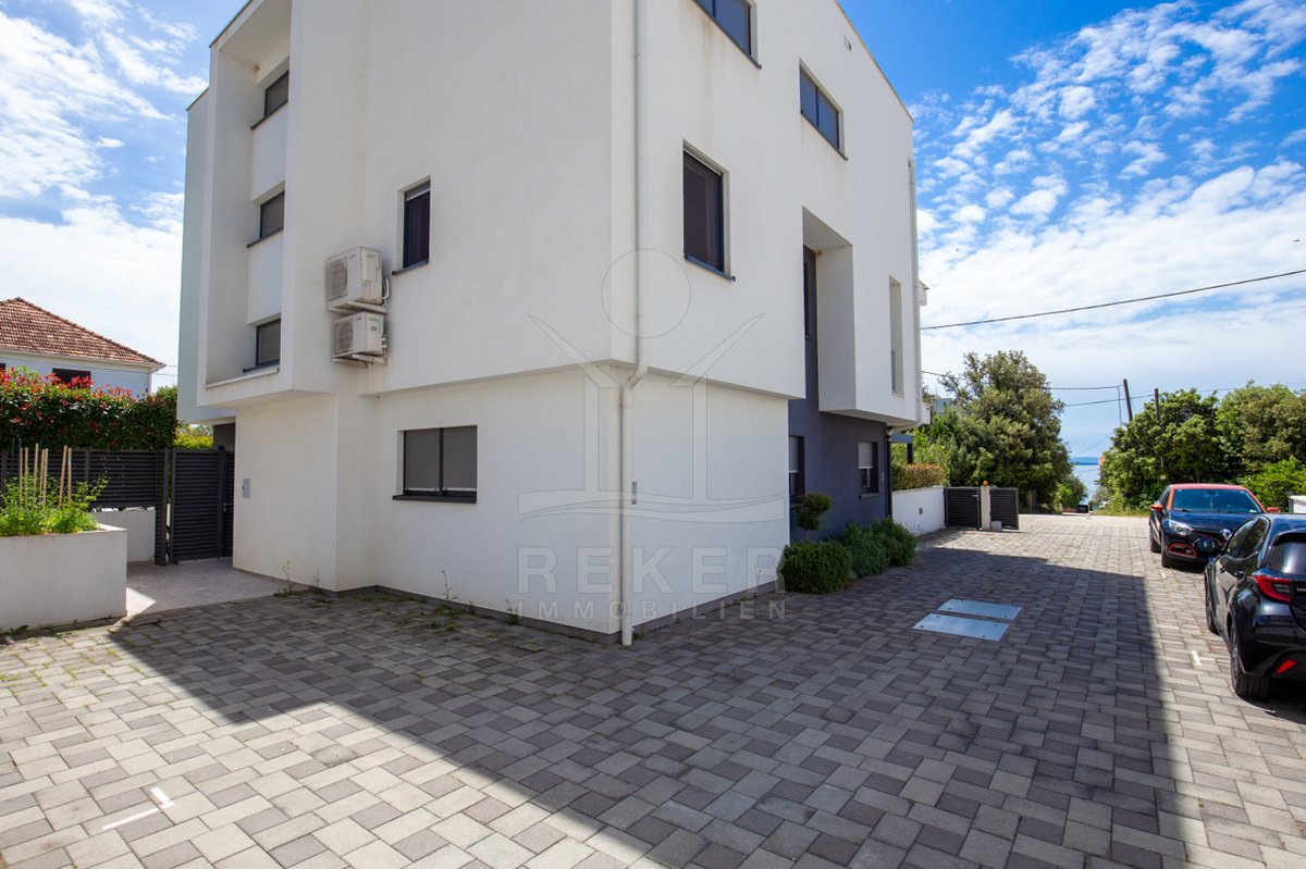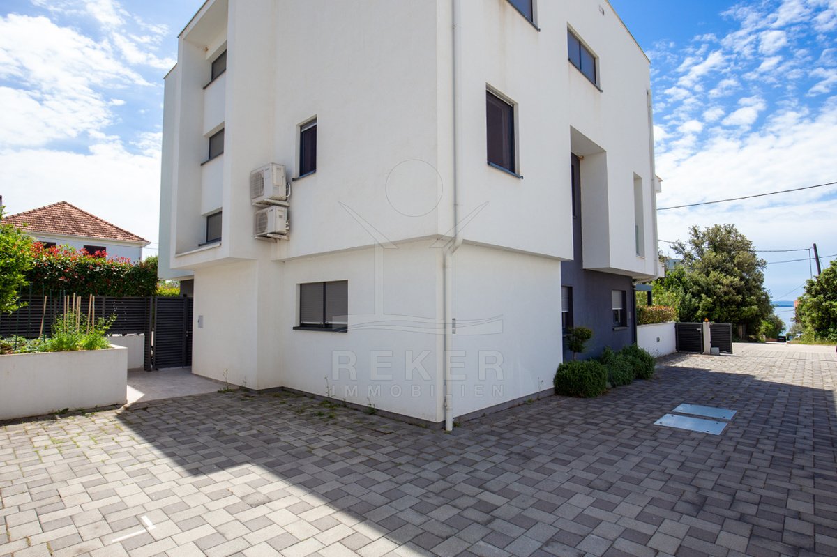 Punta Skala in Petrcane – ein Ort, der für Ruhe, Sonne und klare Luft steht. Nur wenige Schritte trennen Sie vom Meer: 150 Meter und Sie spüren den Sand unter den Füßen. Das Gebäude liegt in einer kleinen Seitenstraße, leicht erhöht und mit freiem