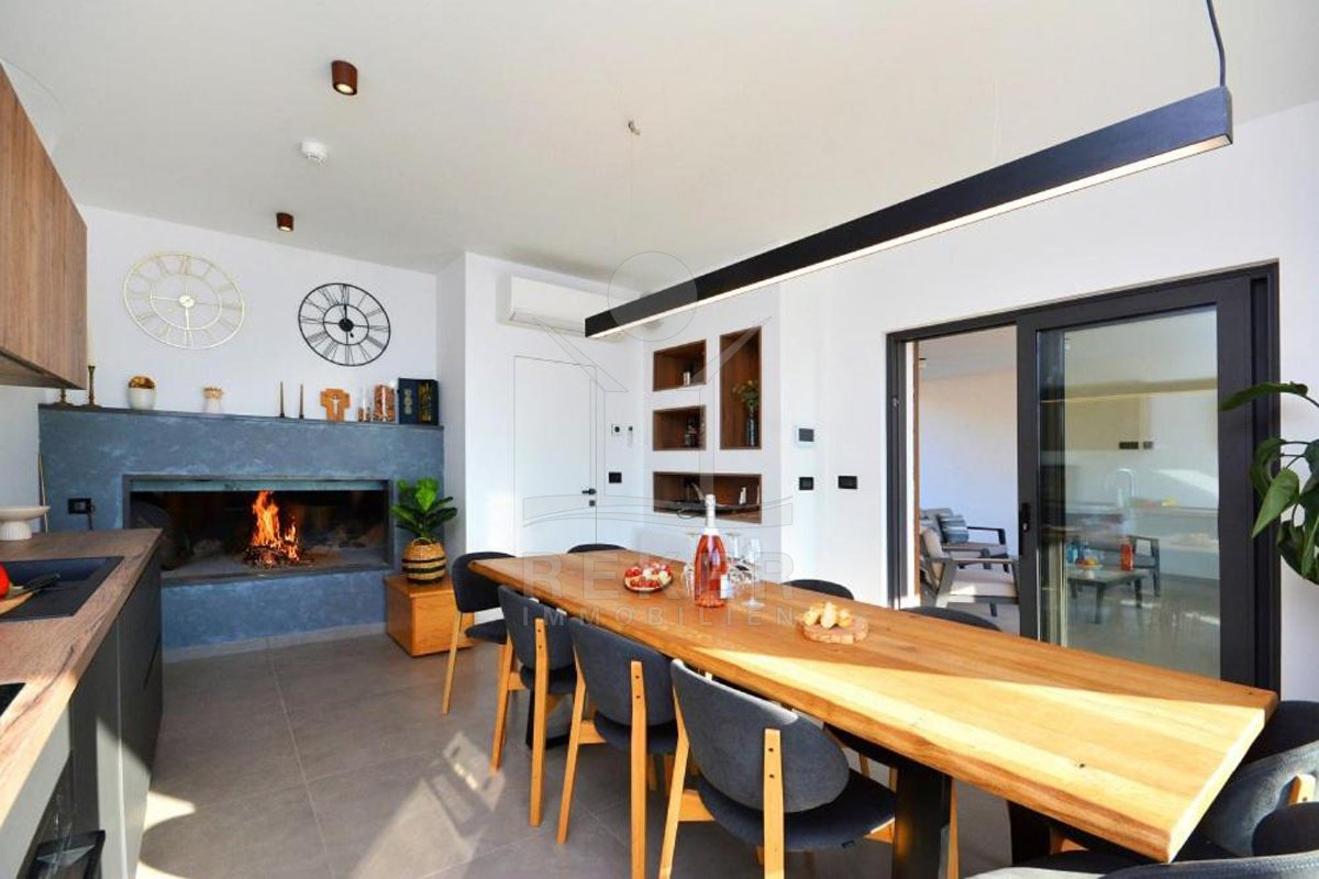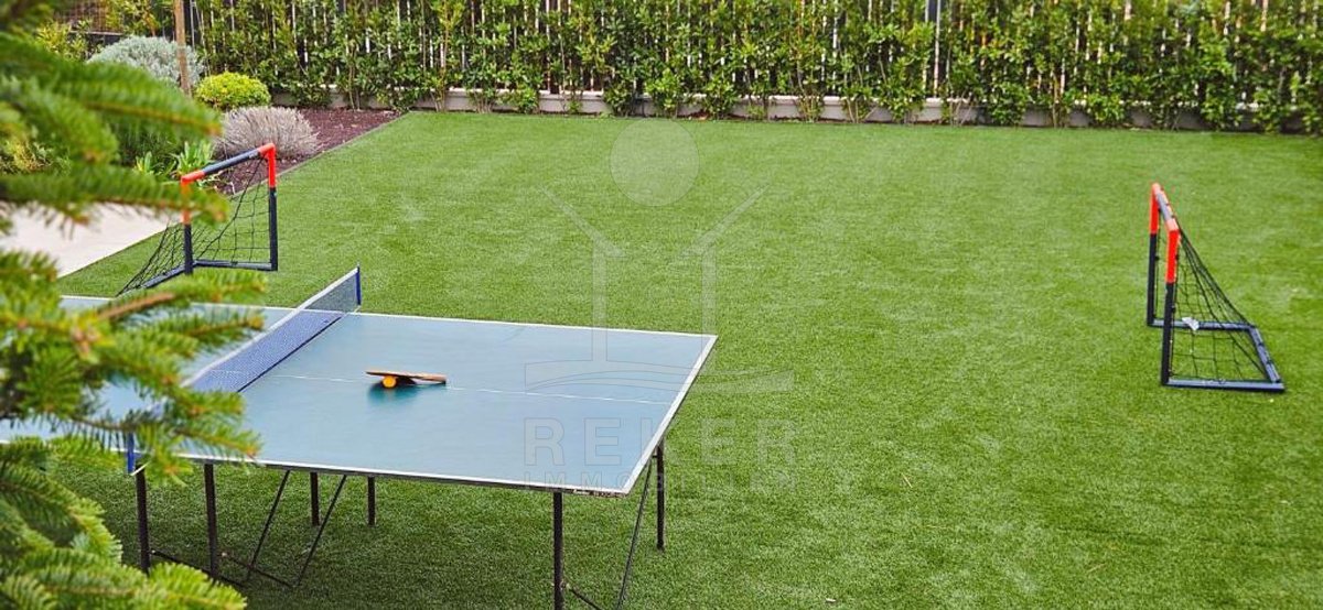 Der Außenbereich ist wie gemacht für lange Sommertage. Der Infinity-Pool schmiegt sich direkt an die Terrasse – davor nichts als das blaue Meer in der Ferne. Daneben: Sonnenliegen, eine Sommerküche mit Grillkamin, ein überdachter Essbereich und sogar ein Garten mit Platz zum Spielen oder Tischtennis. Die Architektur öffnet sich Richtung Süden, Glasgeländer sorgen für ungestörte Sicht. Sonnenuntergänge? Grandios.
