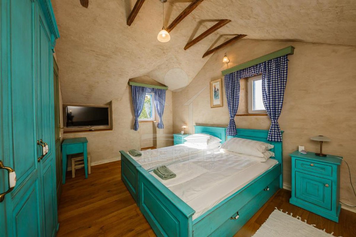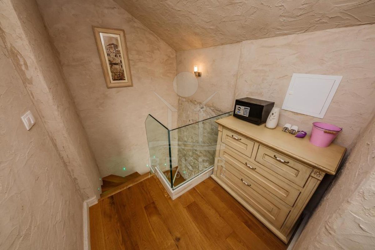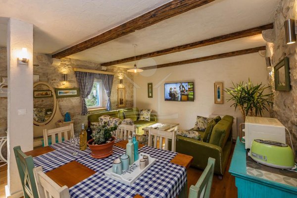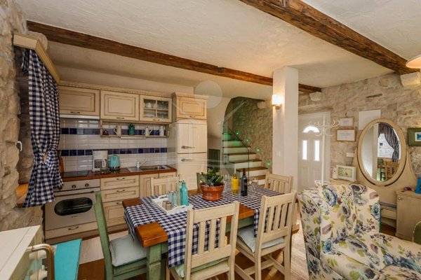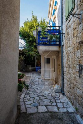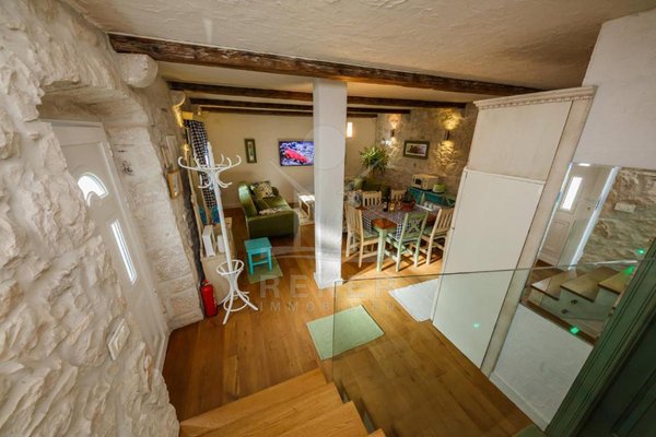 Die Wohnung liegt im ersten Stock und Dachgeschoss eines Steinhauses und hat ihren eigenen Eingang mit einer kleinen Terrasse – ein schöner Platz für den Morgenkaffee. Außen wie innen dominiert rustikaler Charme: Naturstein, traditionelle Fensterläden in kräftigem Blau, Holzbalken und warme Materialien. Der Zugang erfolgt über eine Außentreppe von der Gasse aus ... ganz typisch für diesen Ortsteil.