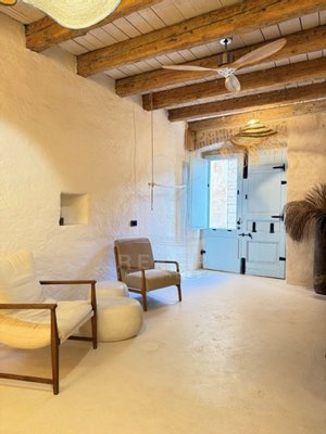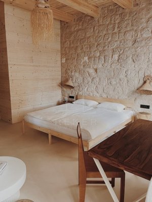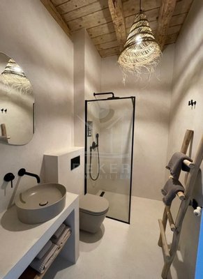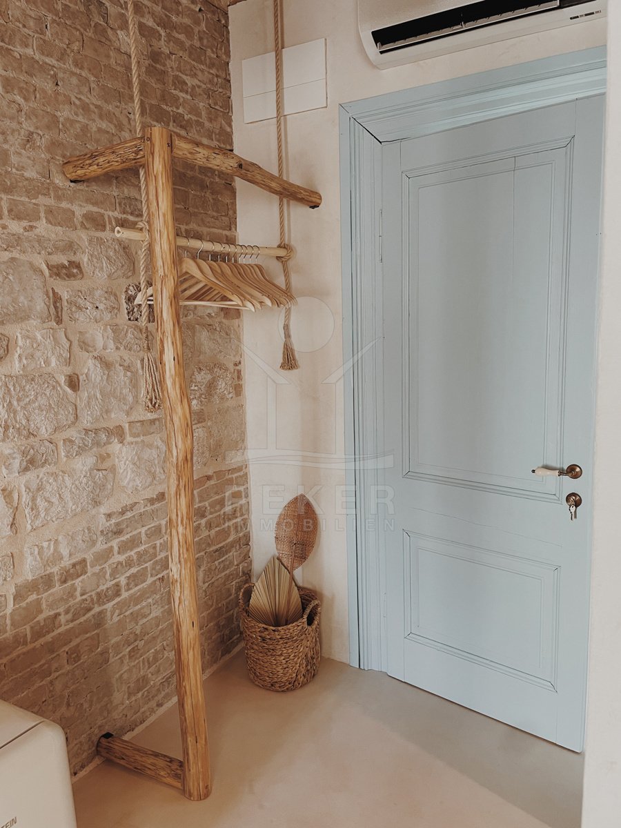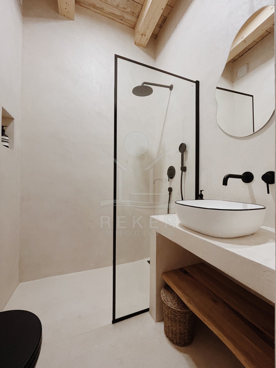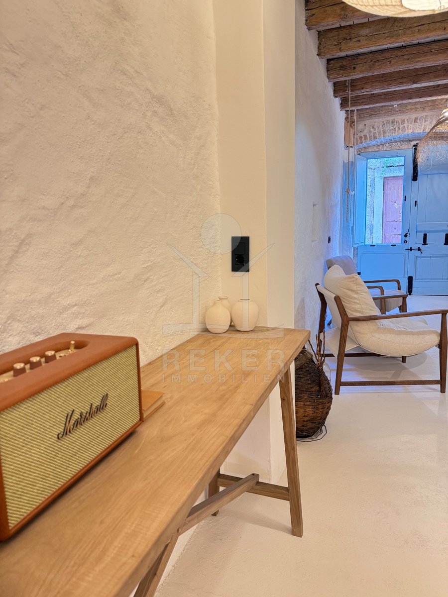 Der Außenbereich passt zur Immobilie: klar, schlicht und genau richtig dimensioniert. Hochwertige Naturmaterialien wie Kalkputz, Stein und Holz ziehen sich auch draußen durch. Der Balkon im ersten Stock ist ein echtes Highlight: rund 14 m² groß, offen und mit viel Licht. Kein Meerblick, aber eine schöne Ruhe. Und: Sie spüren den Sommer dort – von morgens bis abends.