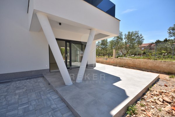 Vodice liegt direkt an der Küste, in einer beliebten, aber nicht überlaufenen Region. Die Wohngegend dieses Neubauprojekts ist ruhig und entspannt, kein Durchgangsverkehr, wenig Lärm. Der Strand ist nur rund 600 Meter entfernt, also bequem zu Fuß