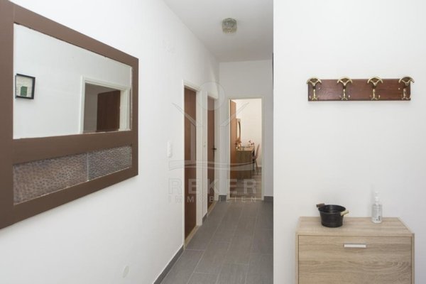 Dieses freistehende Haus auf der Insel Brac steht in einer ruhigen Seitenstraße – nur etwa 200 Meter trennen Sie vom nächsten Strand. Sie gehen zu Fuß zum Meer, ganz ohne Auto. Die Zufahrt ist von zwei Seiten möglich, das bringt Vorteile beim Parken